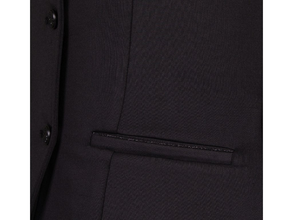 Kvalitné detské sako na preteky vyrobené z vysoko priedušnej štvorcestnej strečovej tkaniny. Použitý materiál poskytuje vysoký komfort pri nosení. Je vybavené klasickým zapínaním na gombíky. Golier, vrecká a gombíky sú zdobené trblietavým lemom, ktorý im dodáva elegantný vzhľad.