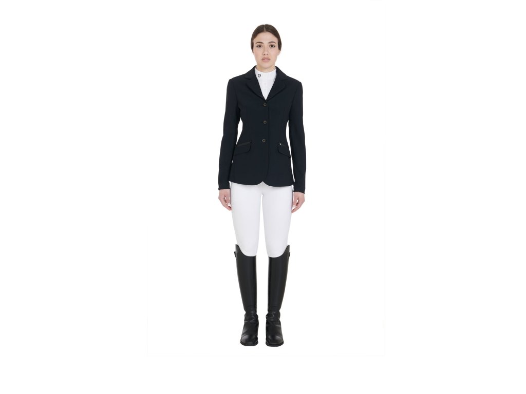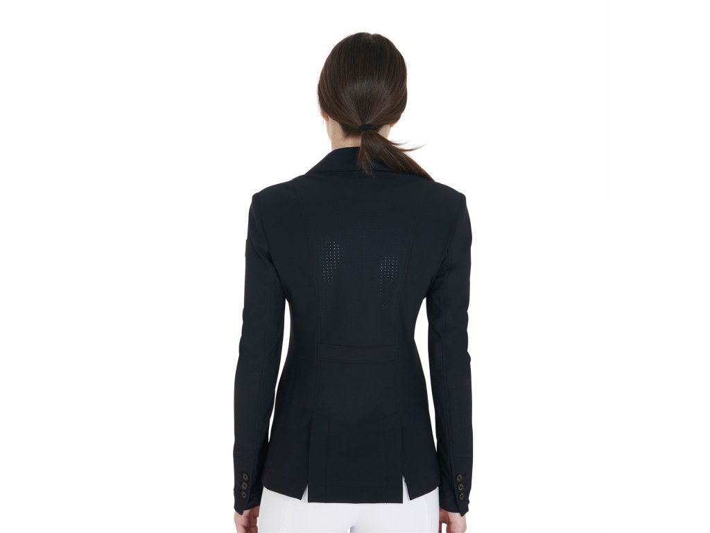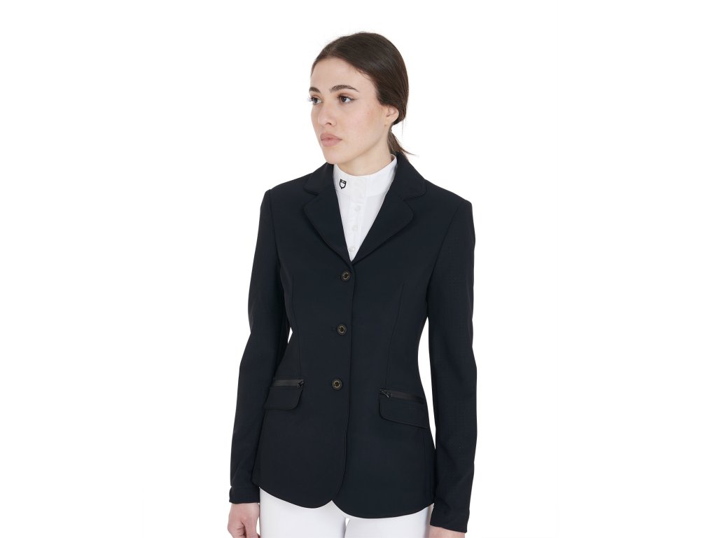 Vysokokvalitné sako na preteky z priedušnej a ultraľahkej technickej tkaniny. Vďaka perforovanej tkanine v hornej časti chrbta a na rukávoch je mimoriadne priedušné a vhodné na letné obdobie. Poskytuje maximálne pohodlie a voľnosť pohybu. Perfektne sedí vďaka ergonomickému strihu. Má zapínanie na tri gombíky a dve vrecká na zips. Manžety sa zapínajú na tri gombíky. Zdobí ho logo Equestro na ľavom ramene a nápis pod vreckom. K dispozícii vo viacerých farbách.