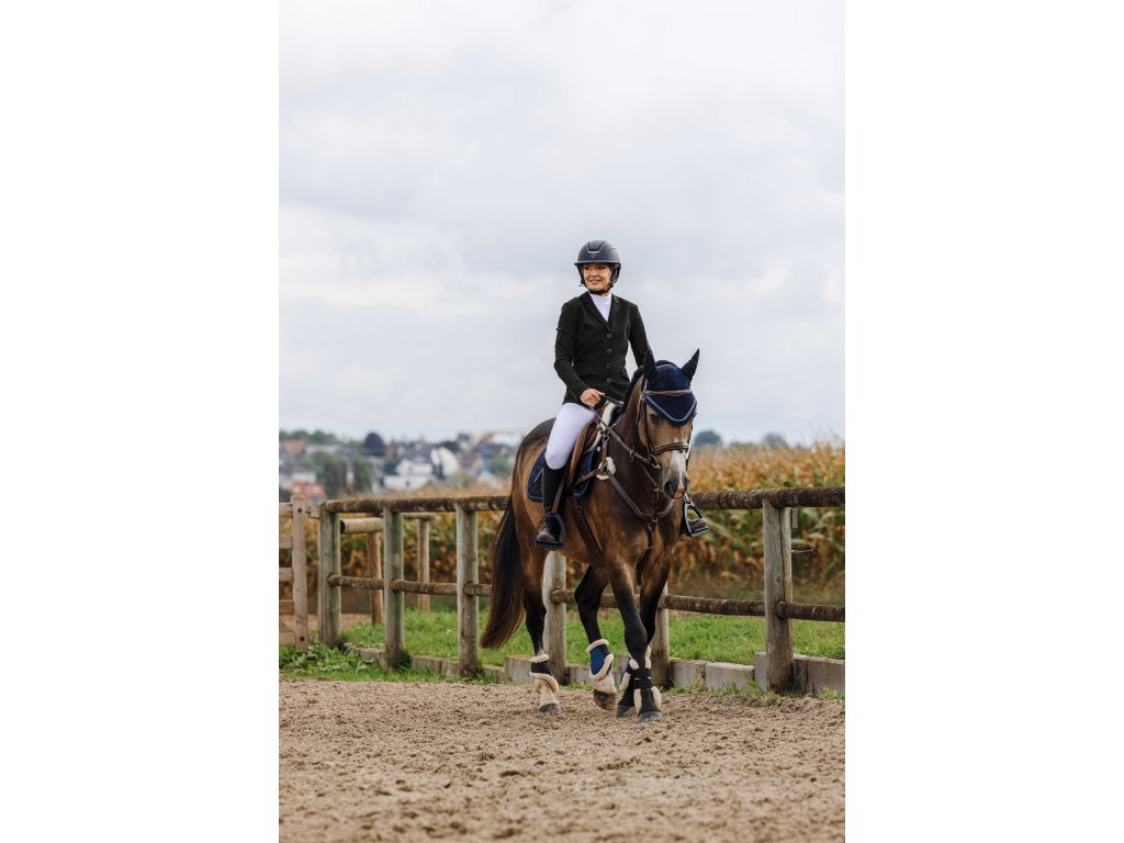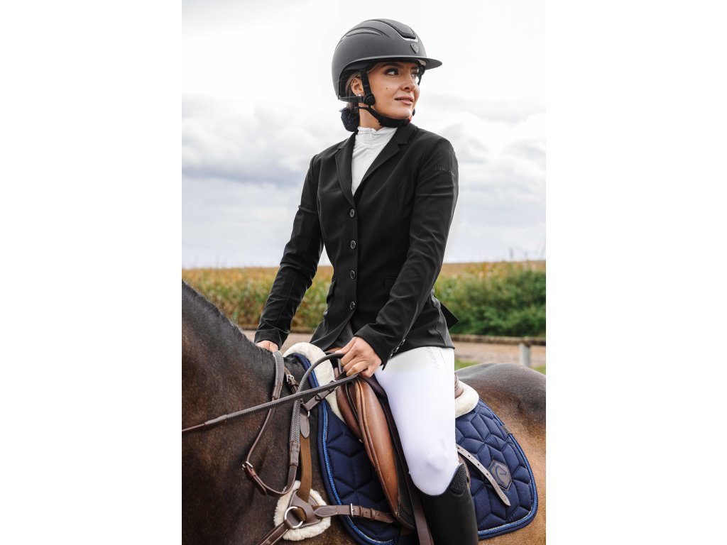 Pohodlné a pružné sako na preteky, ktoré je vyrobené zo štvorsmernej elastickej tkaniny, ktorá ponúka optimálnu voľnosť pohybu a maximálny komfort pri jazde. Vďaka ľahkému materiálu je odolné proti žmolkovaniu a zachováva si elegantný vzhľad aj pri častom nosení. Praktické predné zapínanie na štyri gombíky a zips, ktorý je skrytý pod gombíkovou légou, zaisťujú vyššie pohodlie. Sieťovaná podšívka zlepšuje priedušnosť, zatiaľ čo hladká polyesterová podšívka v rukávoch uľahčuje obliekanie.
