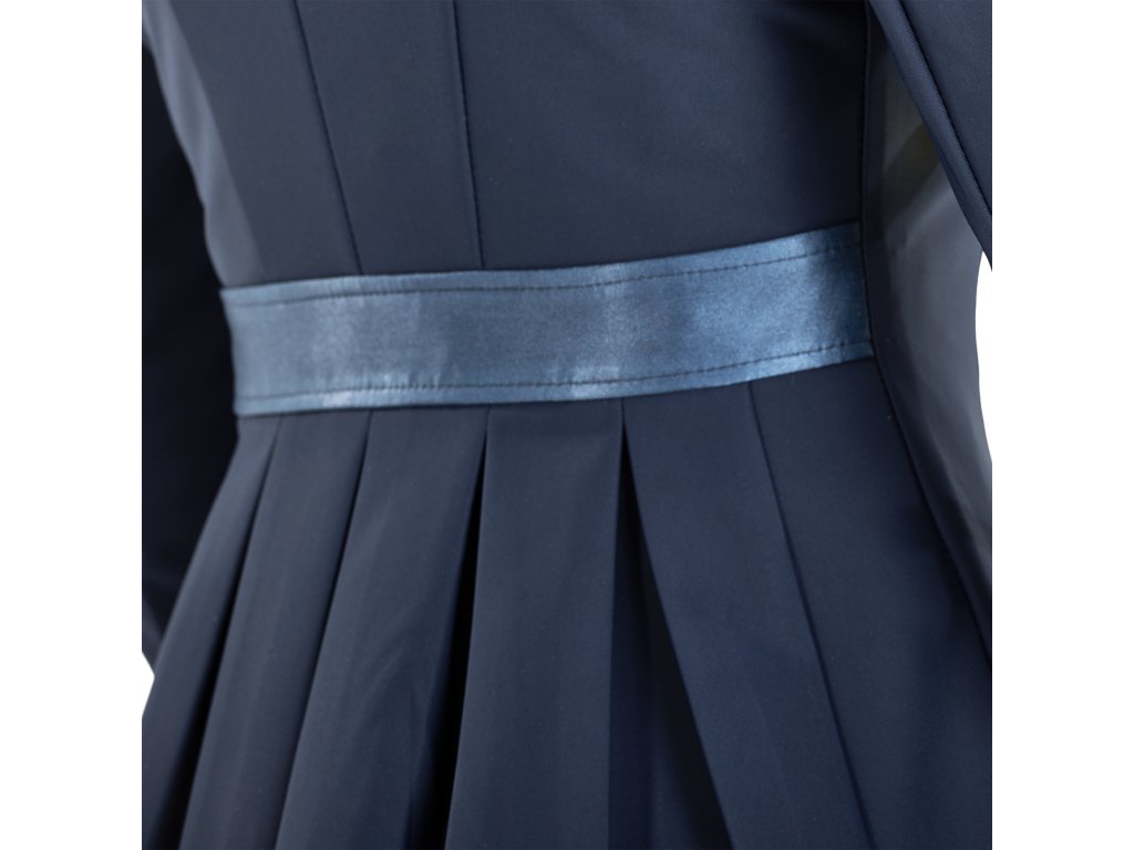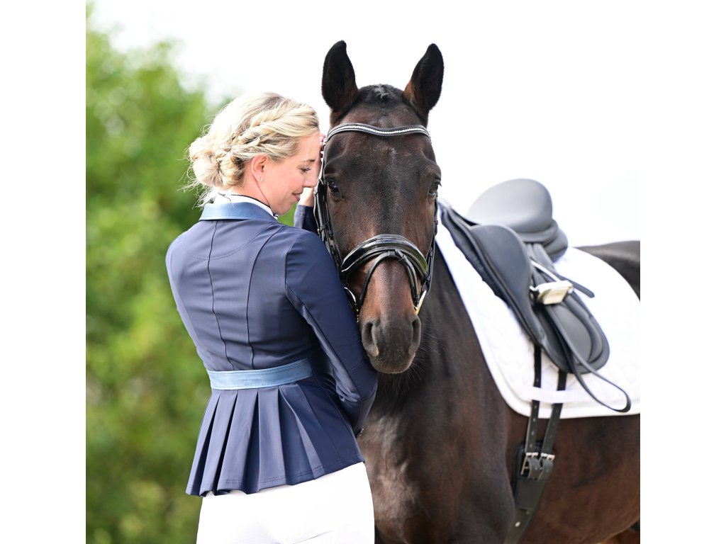 Sako na preteky z ľahkého a predovšetkým funkčného sofsthellového materiálu od značky Busse. Perfektne sedí v strednej polohe vďaka YKK® zipsu pod gombíkovou légou. Sako zámerne nemá predné vrecká ani zadné rozparky, namiesto toho má v zadnej časti viacero záhybov, ktoré poskytujú dostatok priestoru pre sedlo. Má tiež tvarovacie švy na lakťoch. Zdobené elegantným saténovým lemovaním na golieri a zadnom páse a kovovým logom na rukáve. Je vyrobené zo 4-smerného strečového priedušného materiálu a umožňuje tak maximálnu voľnosť pohybu. Materiál je odolný, ľahko sa udržiava a rýchlo schne. Možno prať v práčke. K dispozícii aj v čiernej farbe.