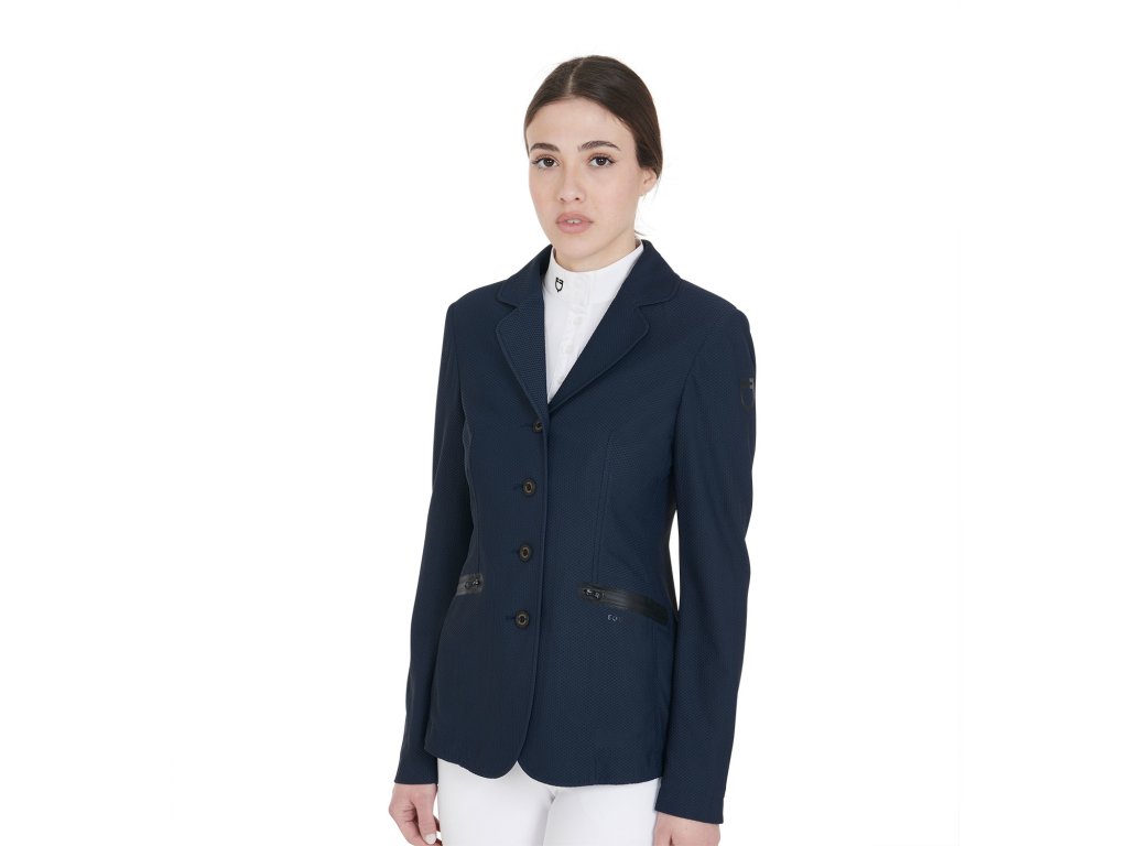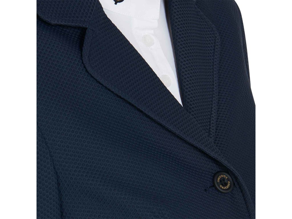 Vysokokvalitné sako na preteky z priedušnej a ultraľahkej technickej tkaniny. Vďaka perforovanej tkanine v hornej časti chrbta a na rukávoch je mimoriadne priedušné a vhodné na letné obdobie. Poskytuje maximálne pohodlie a voľnosť pohybu. Perfektne sedí vďaka ergonomickému strihu. Má zapínanie na štyri gombíky a dve vrecká na zips. Manžety sa zapínajú na tri gombíky. Zdobí ho logo Equestro na ľavom ramene a nápis pod vreckom. K dispozícii vo viacerých farbách.