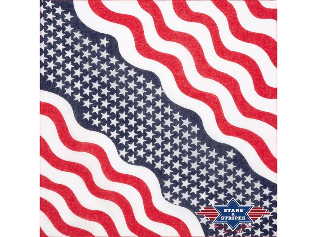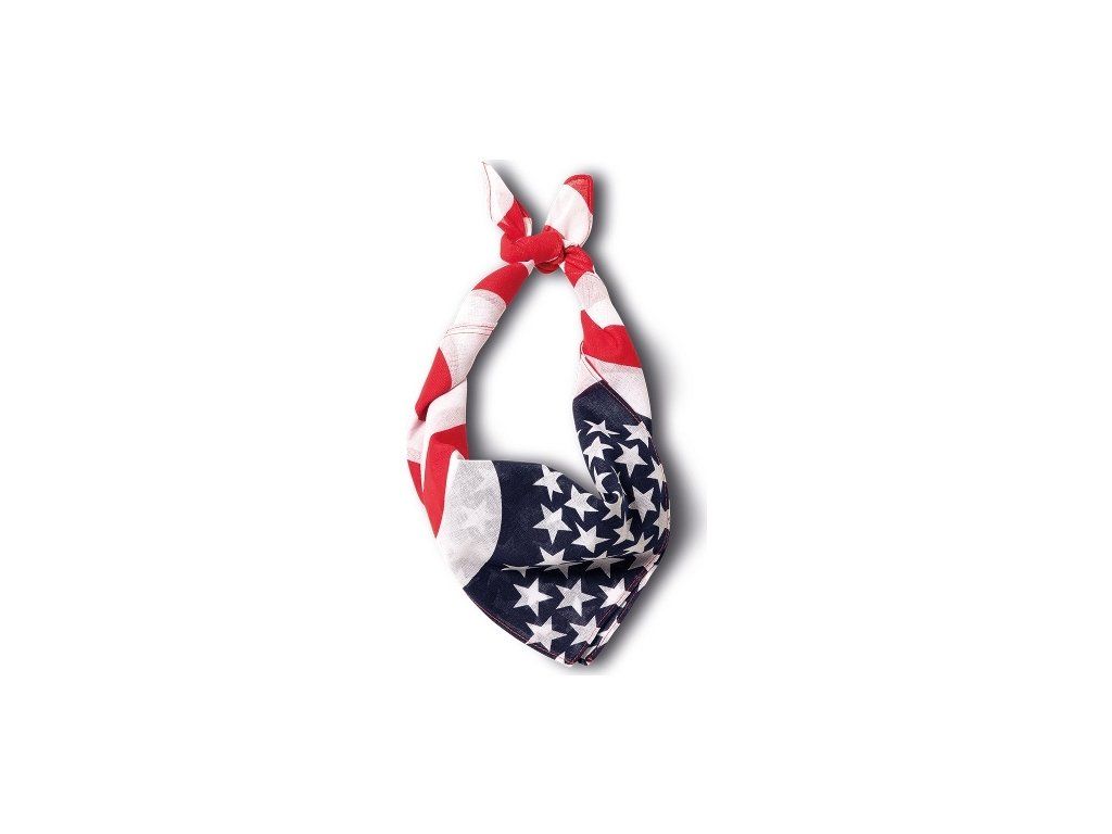 Štýlová šatka zo 100 % bavlny s motívom vlajky USA. Je to módny doplnok, ktorý sa dá nosiť mnohými spôsobmi. Vhodná okolo krku, ruky aj nohy, ale môže slúžiť aj ako skvelá pokrývka hlavy.Rozmer: 54x54 cm.
