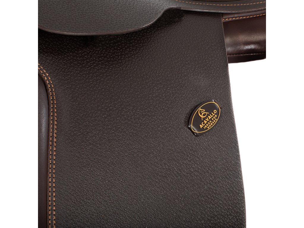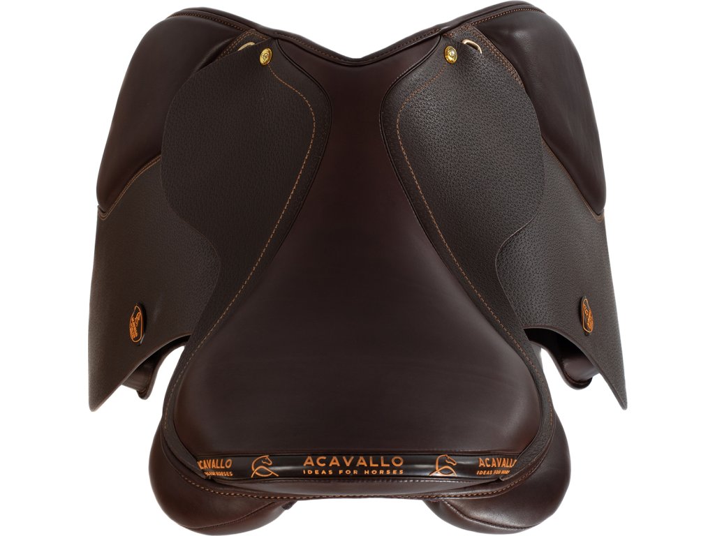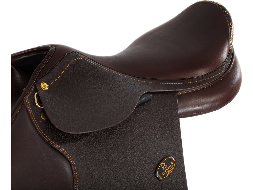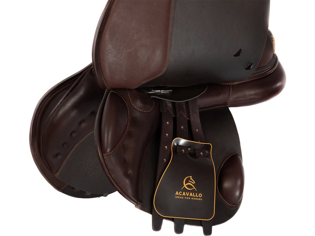 Prémiové kožené skokové sedlo, posedlie a kolenné opierky z full-grain teľacej kože, bočnice z top-grain kože, špeciálny Acavallo MAG systém, ktorý umožňuje jazdcovi prispôsobiť si sedlo podľa anatómie svojho koňa a upraviť si polohu komory, dá sa dokonca nastaviť aj akonáhle jazdec nasadne, úprava len štyrmi jednoduchými pohybmi, kostra sedla je vyrobená zo zmiešaného nylonu (plast-syntetický polymér, syntetické vlákno vyrobené priamo z uhlia, vody a vzduchu), takže je elastická a pohybuje sa prirodzene spolu s koňom, veľké sedlové vankúše: integrované vlnené, odnímateľná kolenná a stehenná opierka. Jednotlivé sedlá Acavallo sa líšia zložením kostry sedla a typom sedlových vankúšov.