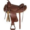 Westernové sedlo vyrobené z kvalitnej olejovanej kože. Posedlie je z hladkej kože, polstrované. Sedlo je na spodnej strane podložené mäkkým umelým barančekom. Zdobené kvetinovým vzorom a kontrastným prešívaním. Dodáva sa so zadným podbrušníkom. Vo veľkostiach posedlia 15,5", 16" a 17".