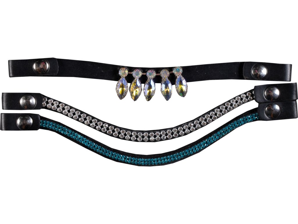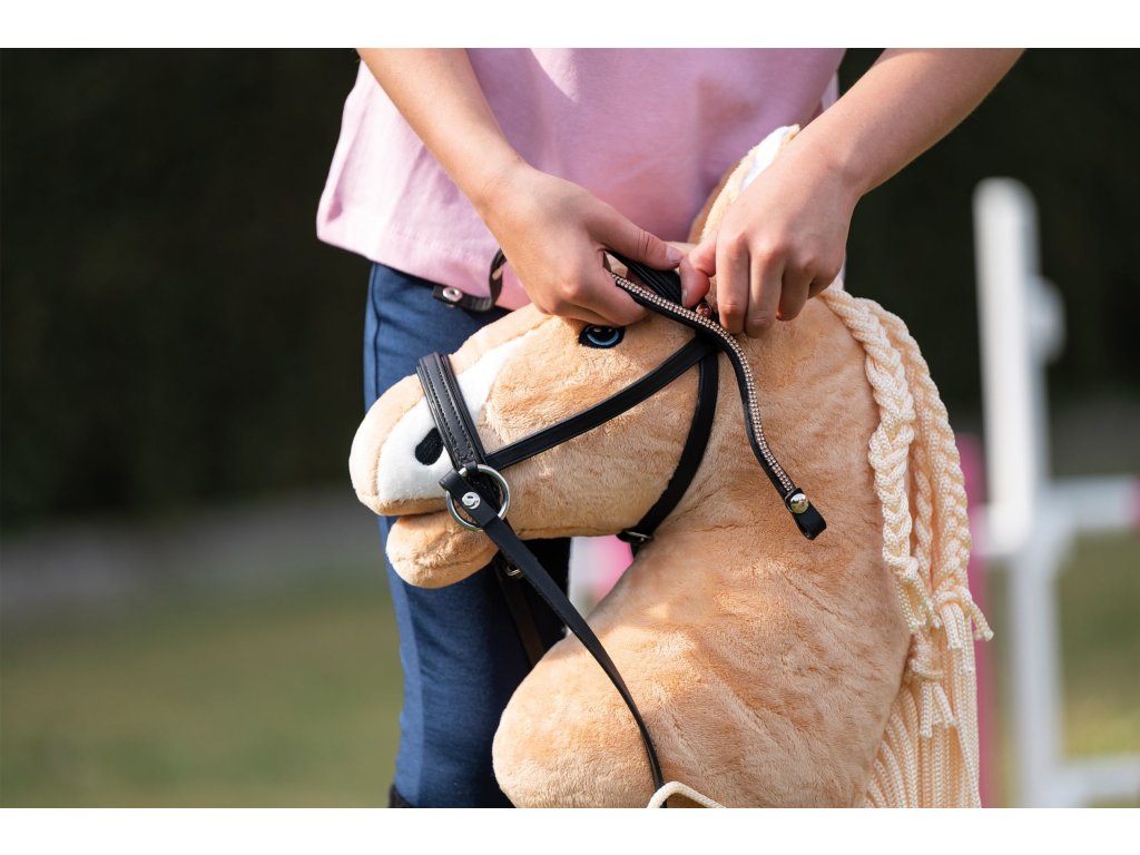 Sada 3 kusov čeleniek z imitácie kože a rôzneho dizajnu od značky HKM na uzdečky k Hobby Horse koníkom. Čelenky sa dajú ľahko upevniť pomocou gombíkov. Sú zdobené kamienkami a prešívaním.