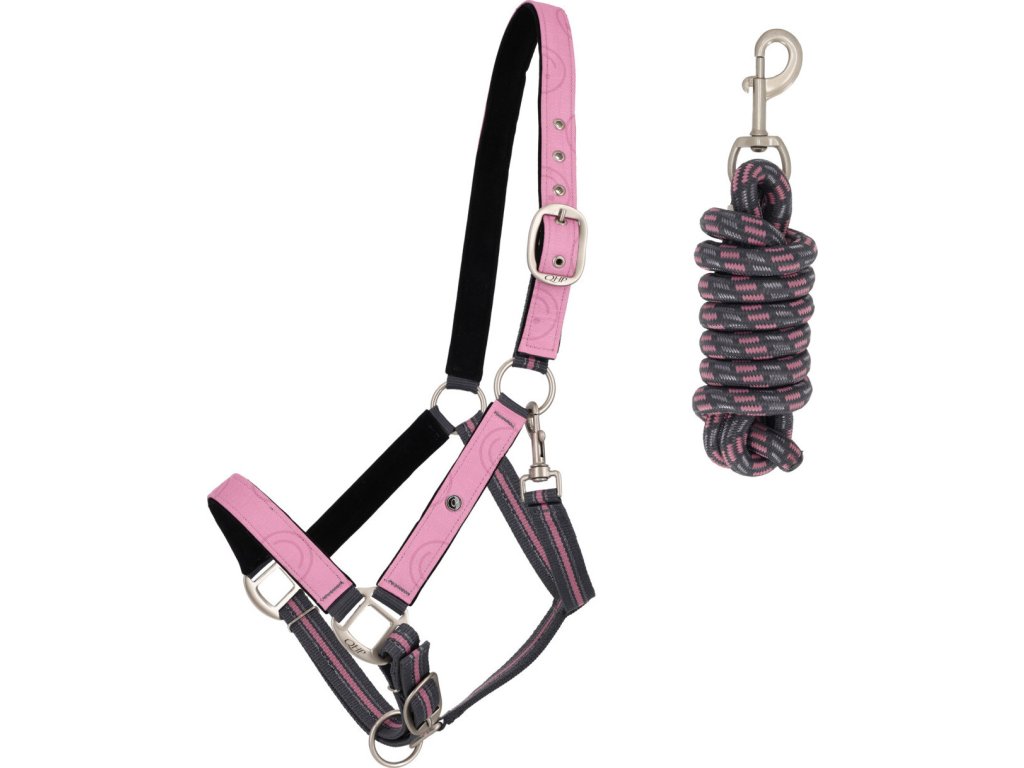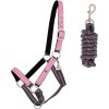 Kvalitní set ohlávky s barevně sladěným vodítkem. Měkké polstrování na nátylníku, lícnicích a nánosníku zajišťuje vysoký komfort pro koně a pomáhá předcházet vzniku otlaků. Ohlávka je vyrobena z pevného a odolného polyesteru a polypropylenu, které zaručují dlouhou životnost i při pravidelném používání. Černé kování ze zinku a oceli podtrhuje moderní vzhled a zároveň poskytuje spolehlivost a pevnost. Součástí setu je tříbarevné vodítko o délce 2 metry, které s ohlávkou tvoří sladěný celek. Celá sada je dodávána v praktické plastové tašce s uchem a zapínáním na zip, vhodné pro skladování i přepravu. Lze prát v pračce na 30 °C (doporučujeme použít prací sáček). Nepoužívejte aviváž a nesušte v sušičce.