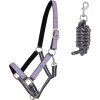 Kvalitní set ohlávky s barevně sladěným vodítkem. Měkké polstrování na nátylníku, lícnicích a nánosníku zajišťuje vysoký komfort pro koně a pomáhá předcházet vzniku otlaků. Ohlávka je vyrobena z pevného a odolného polyesteru a polypropylenu, které zaručují dlouhou životnost i při pravidelném používání. Černé kování ze zinku a oceli podtrhuje moderní vzhled a zároveň poskytuje spolehlivost a pevnost. Součástí setu je tříbarevné vodítko o délce 2 metry, které s ohlávkou tvoří sladěný celek. Celá sada je dodávána v praktické plastové tašce s uchem a zapínáním na zip, vhodné pro skladování i přepravu. Lze prát v pračce na 30 °C (doporučujeme použít prací sáček). Nepoužívejte aviváž a nesušte v sušičce.