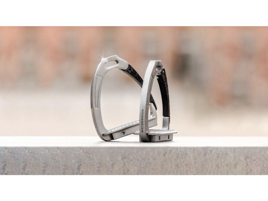 Bezpečnostné strmene z vysokokvalitného hliníka so 6,5 cm širokou nášľapnou plochou pre dokonalú rovnováhu. Vďaka hrotom sú protišmykové a vďaka pántu na vonkajšom okraji zaisťujú bezpečnosť. V prípade pádu sa pánt otvorí a noha jazdca sa nezasekne. Veľkosť 12 cm.