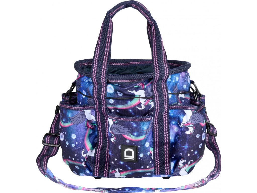 Detská uzatvárateľná taška na čistenie s nastaviteľným a odnímateľným ramenným popruhom. Je vybavená 6 vonkajšími vreckami, malým vnútorným vreckom na zips a veľkým vnútorným priestorom, ktorý sa dá ľahko uzavrieť sťahovacou šnúrkou. Taška je zdobená motívmi hviezdičiek a jednorožcov. Vyrobená z pevného 600 D polyesteru a má spodné plastové nožičky proti znečisteniu. Materiál je vodoodolný (5 000 mm) a priedušný (5000 vmp).