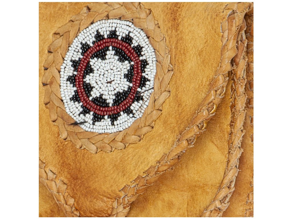 Malá praktická taštička na opasok. Vyrobená z kvalitného koženého materiálu s farebnými akcentmi a strapcami. Vzhľad tašky je doplnený indiánskym motívom a štýlovým šnurovaním. Jednoduché upevnenie.Rozmery: výška: 13 cm, šírka: 13 cm, hĺbka: 2,5 cm.
