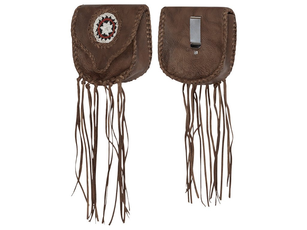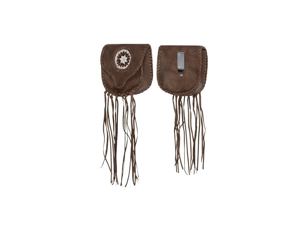 Malá praktická taštička na opasok. Vyrobená z kvalitného koženého materiálu s farebnými akcentmi a strapcami. Vzhľad tašky je doplnený indiánskym motívom a štýlovým šnurovaním. Jednoduché upevnenie. Rozmery: výška: 13 cm, šírka: 13 cm, hĺbka: 2,5 cm.