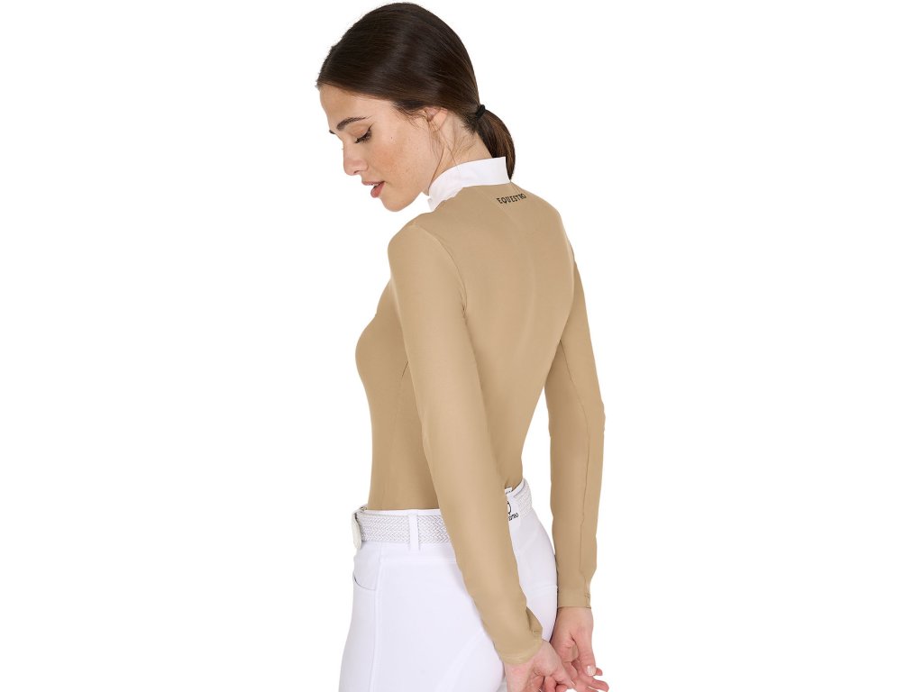 Vysokokvalitné tričko na preteky s dlhým rukávom vyrobené z technickej tkaniny. Je priedušné a zároveň hrejivé, vhodné na chladné dni, udržiava ideálnu telesnú teplotu. Vďaka elastickému materiálu a slim fit strihu perfektne sedí. Golier a bavlnený detail našitý na hrudi dodáva tričku elegantný vzhľad. Vybavené zapínaním na gombíky. Zdobia ho trblietavé kamienky na hrudi a logo s nápisom Equestro. K dispozícii vo viacerých farbách.