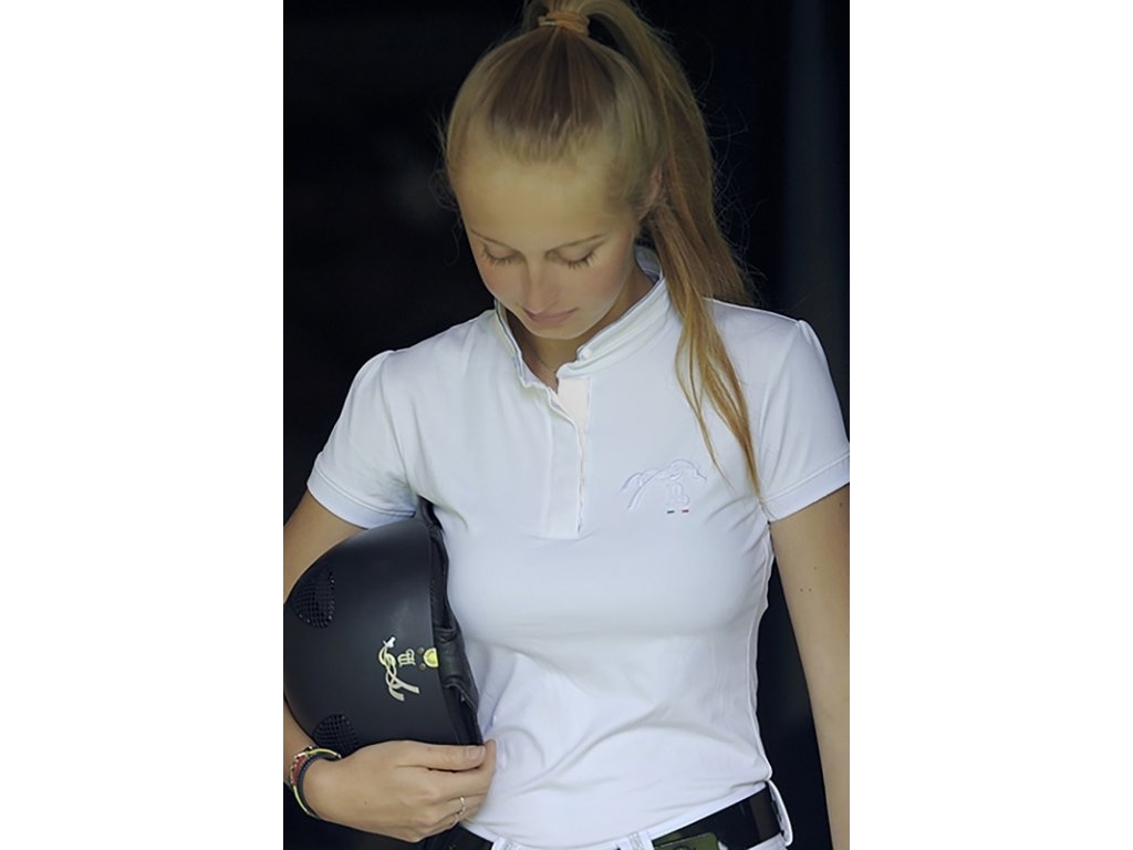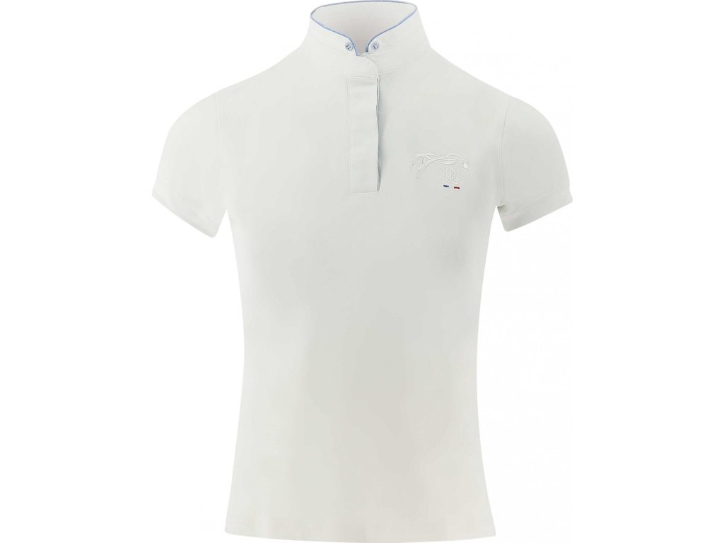 Dámske polo tričko na preteky Madrid s krátkym rukávom a mierne elastickými manžetami. Má otvorený golier s dvoma viditeľnými gombíkmi a tromi gombíkmi skrytými pod légou. Na spodných stranách je vybavené rozparkami s kontrastným lemovaním. Hrudník zdobí logo doplnené francúzskou vlajkou.