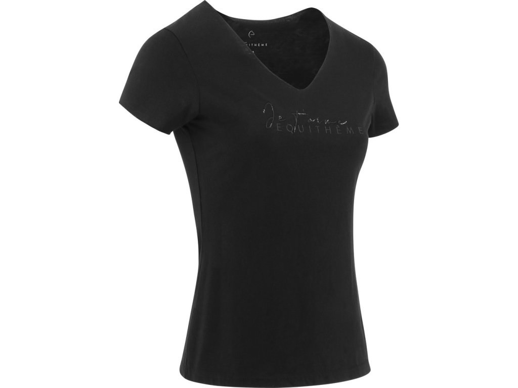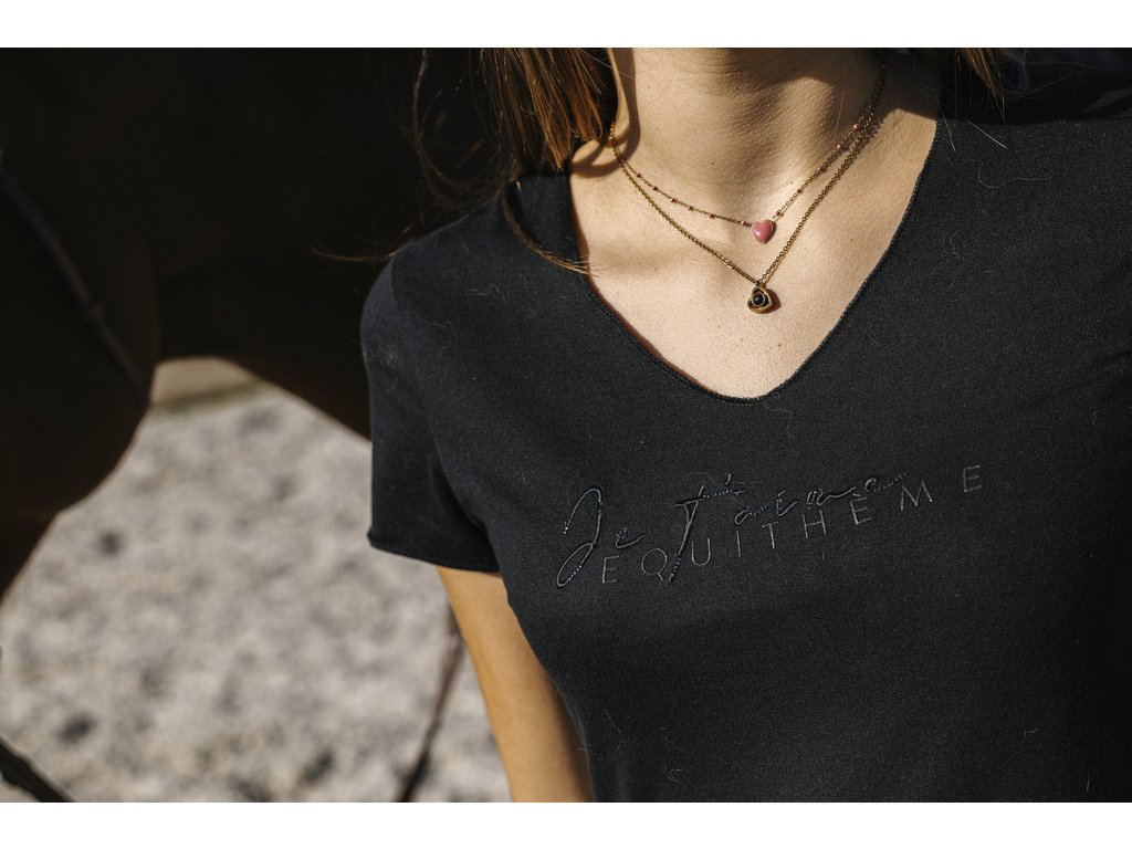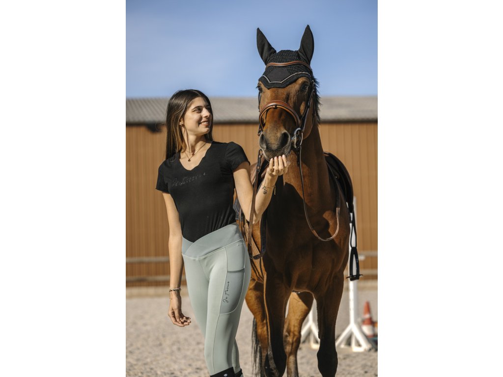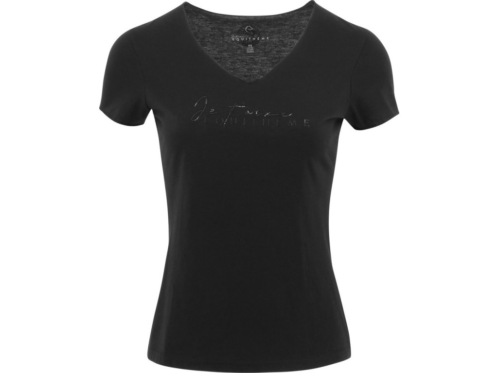 Štýlové tričko s výstrihom do V a kamienkami je ideálnou voľbou na každodenné nosenie aj voľný čas. Vďaka kombinácii bavlny a polyesteru je materiál príjemne ľahký, odolný a komfortný na dotyk. Úzky strih elegantne zvýrazní postavu, zatiaľ čo výstrih do V dodáva tričku sofistikovaný vzhľad. Predná strana je ozdobená decentnými kamienkami a logom značky Equithème, ktoré podčiarkujú jeho luxusný štýl.