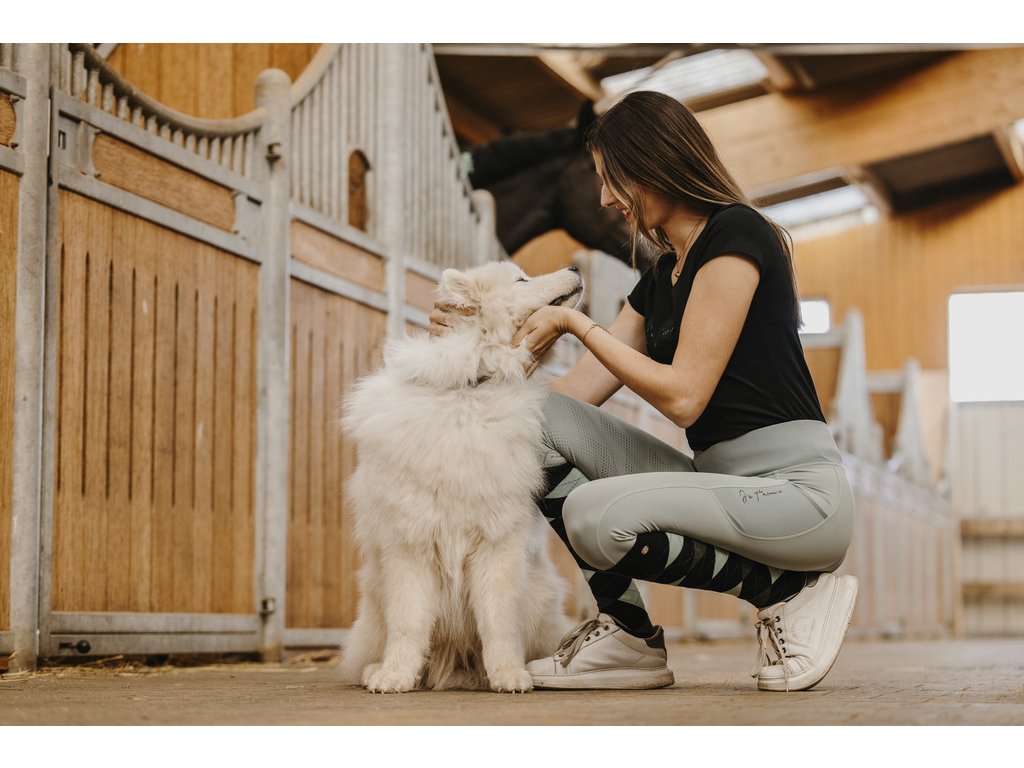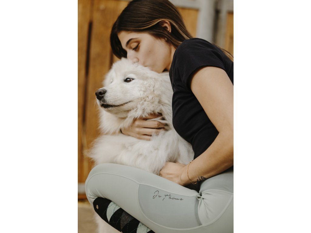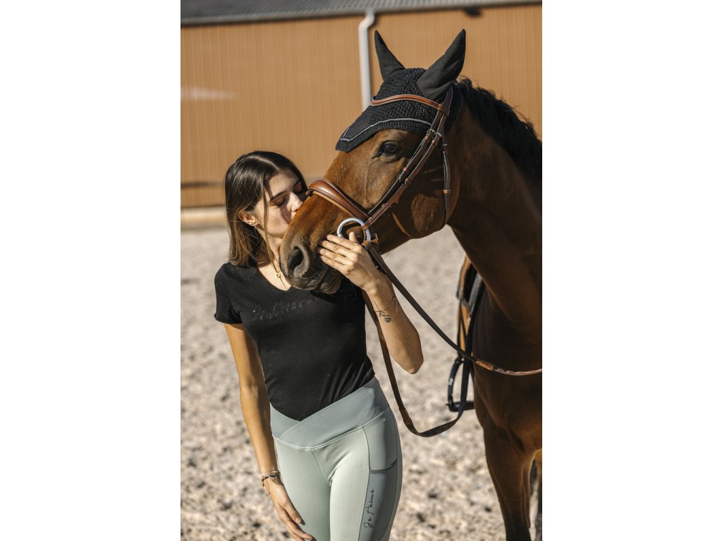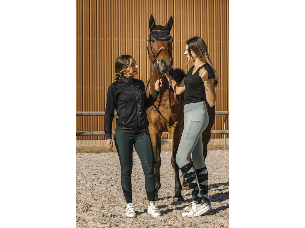 Štýlové tričko s výstrihom do V a kamienkami je ideálnou voľbou na každodenné nosenie aj voľný čas. Vďaka kombinácii bavlny a polyesteru je materiál príjemne ľahký, odolný a komfortný na dotyk. Úzky strih elegantne zvýrazní postavu, zatiaľ čo výstrih do V dodáva tričku sofistikovaný vzhľad. Predná strana je ozdobená decentnými kamienkami a logom značky Equithème, ktoré podčiarkujú jeho luxusný štýl.