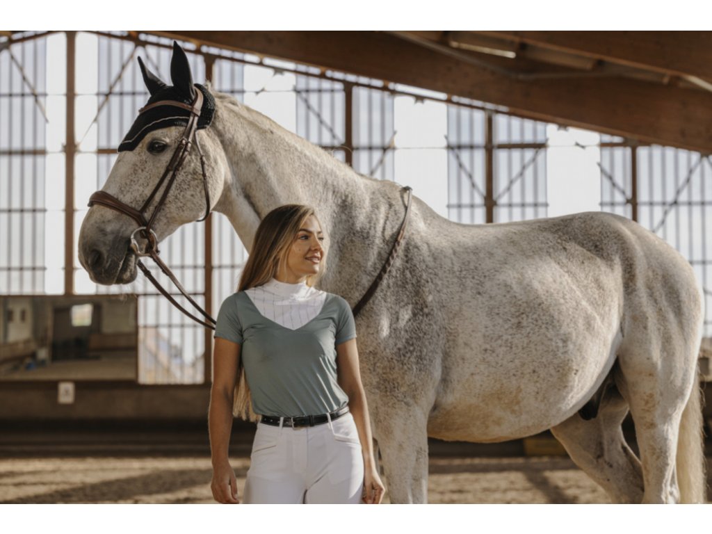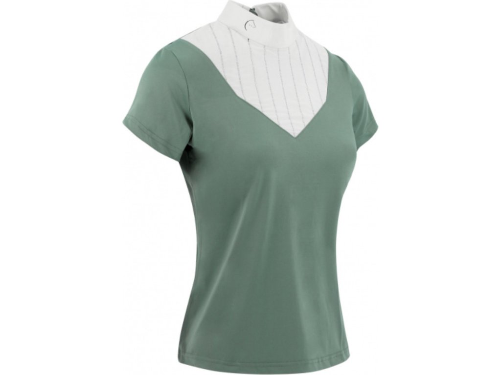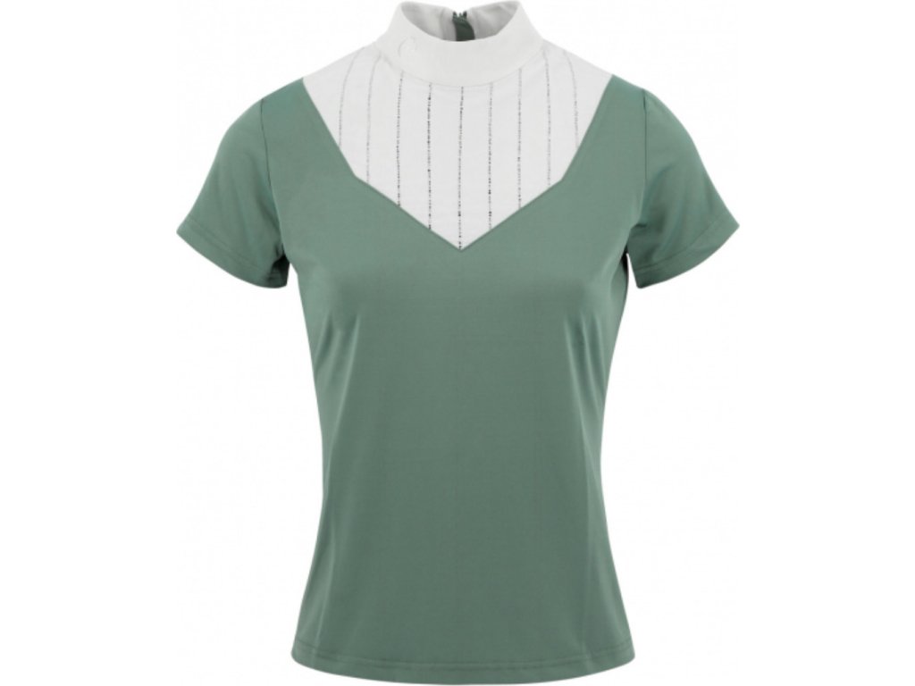 Moderné tričko na preteky, ktoré spája športovú funkčnosť s elegantným vzhľadom. Ľahký, priedušný a rýchloschnúci materiál so štvorsmernou pružnosťou zaisťuje voľnosť pohybu a maximálne pohodlie pri akejkoľvek aktivite. Elegantný výstrih do V je zdobený jemnými kamienkami a flitrami, zadné zapínanie na zips uľahčuje obliekanie.