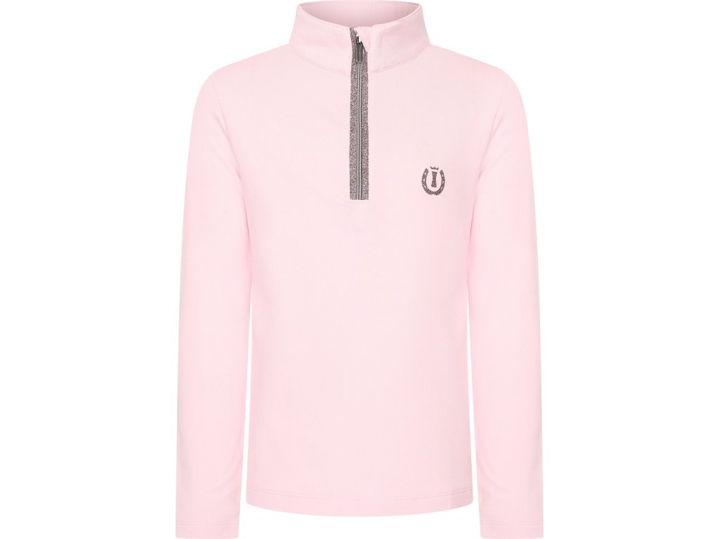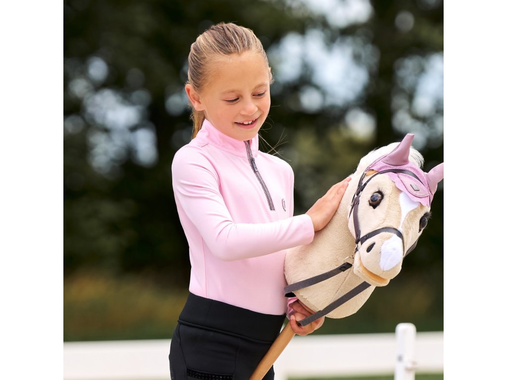 Detské tričko Abby spája funkčnosť s výrazným a hravým dizajnom, ktorý si mladé jazdkyne zamilujú. Je vyrobené z príjemného, pružného džersejového materiálu, ktorý zaisťuje pohodlie po celý deň pri jazdení aj pri práci v stajni. Dlhé rukávy sú ideálne do chladnejších dní alebo ako vrstva pod vestu či bundu. Polovičný zips je doplnený trblietavým detailom a ochranou brady pre vyšší komfort.