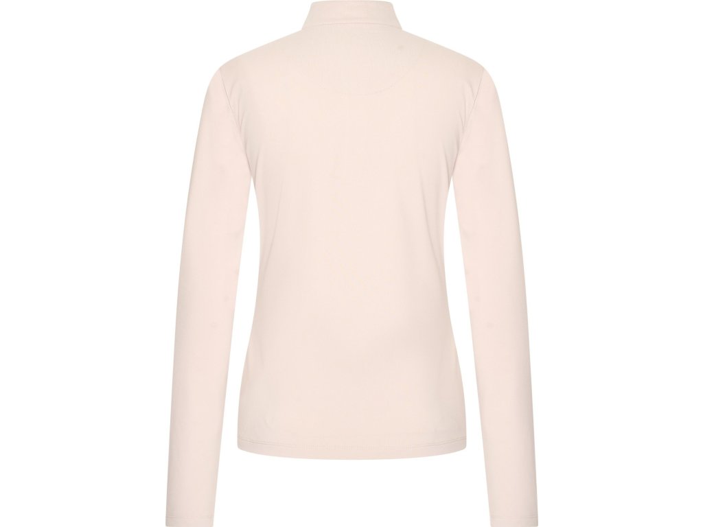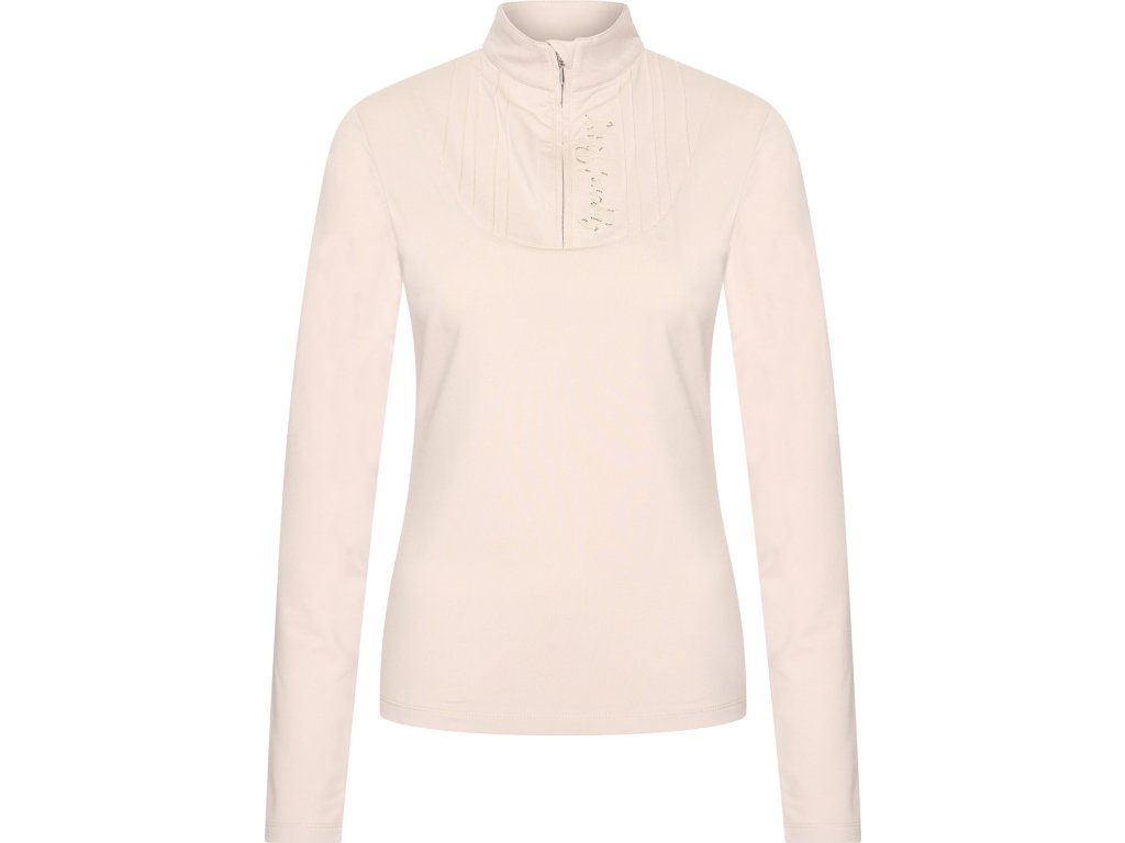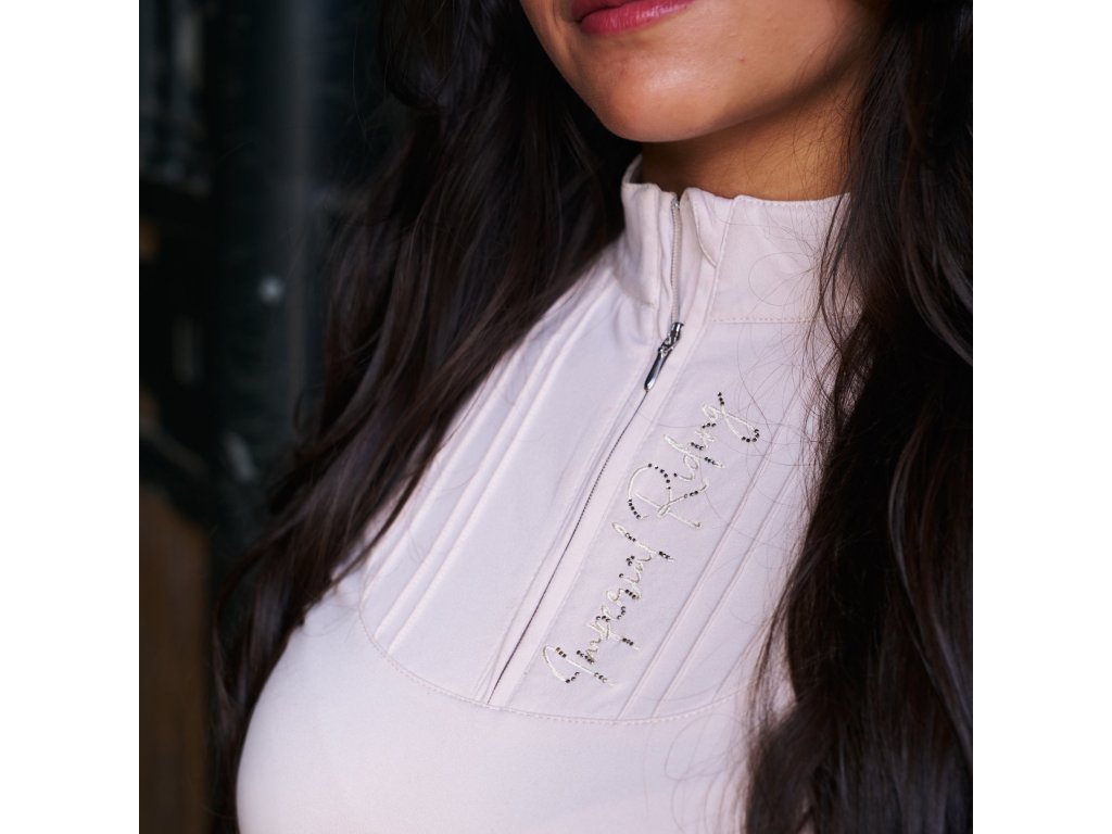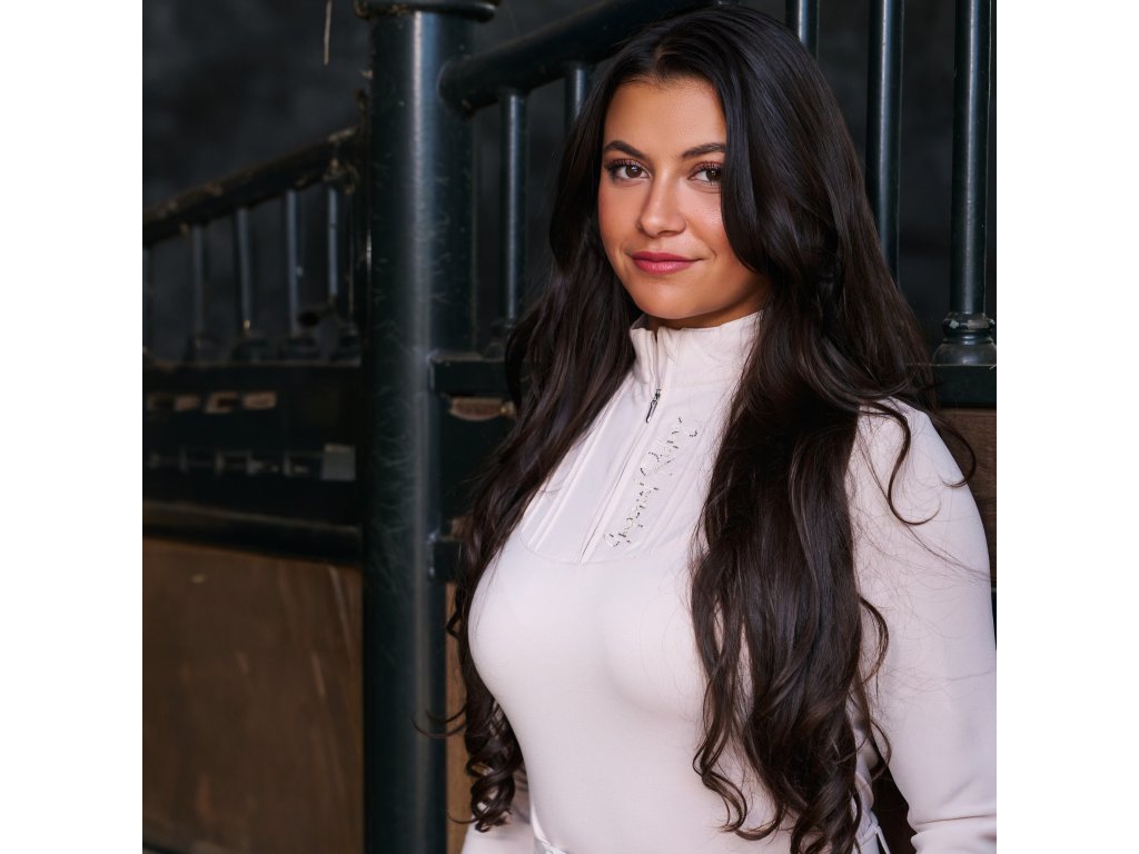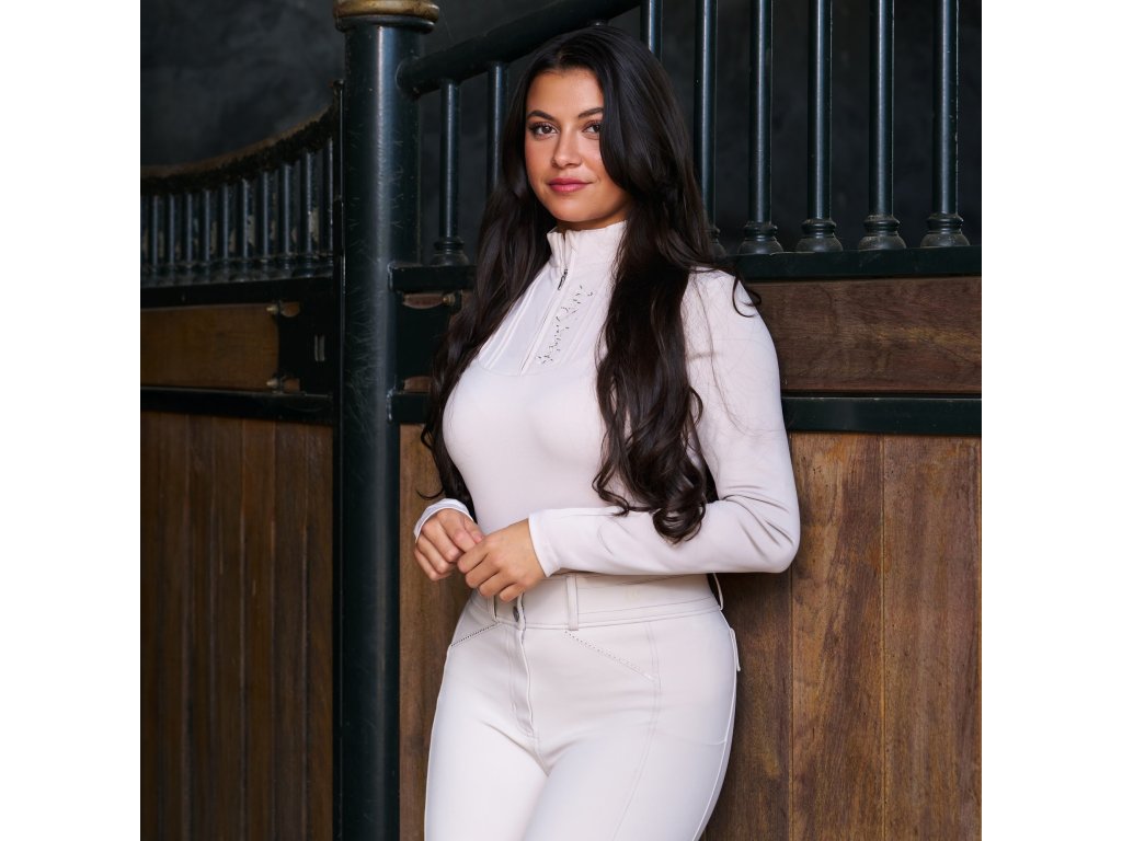 Elegantné tričko s dlhým rukávom kombinuje pohodlie a trblietavý štýl. Mäkký vnútorný materiál zaisťuje príjemné teplo a komfort počas chladnejších dní. Predná časť je zdobená decentnými kamienkami a prešívaním. Tričko má vyšší golier s polovičným zipsom. Ideálna voľba pre jazdkyne, ktoré chcú vyzerať elegantne a cítiť sa pohodlne v stajni aj mimo nej.