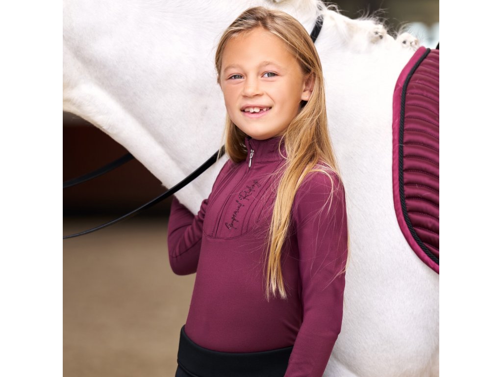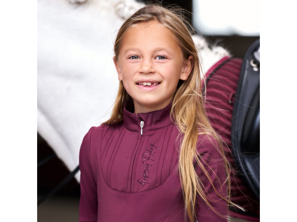 Elegantné tričko s dlhým rukávom kombinuje pohodlie a trblietavý štýl. Mäkký česaný vnútorný materiál zaisťuje príjemné teplo a komfort počas chladnejších dní. Predná časť je zdobená decentnými kamienkami a prešívaním. Tričko má vyšší golier s polovičným zipsom. Ideálna voľba pre jazdkyne, ktoré chcú vyzerať elegantne a cítiť sa pohodlne v stajni aj mimo nej.