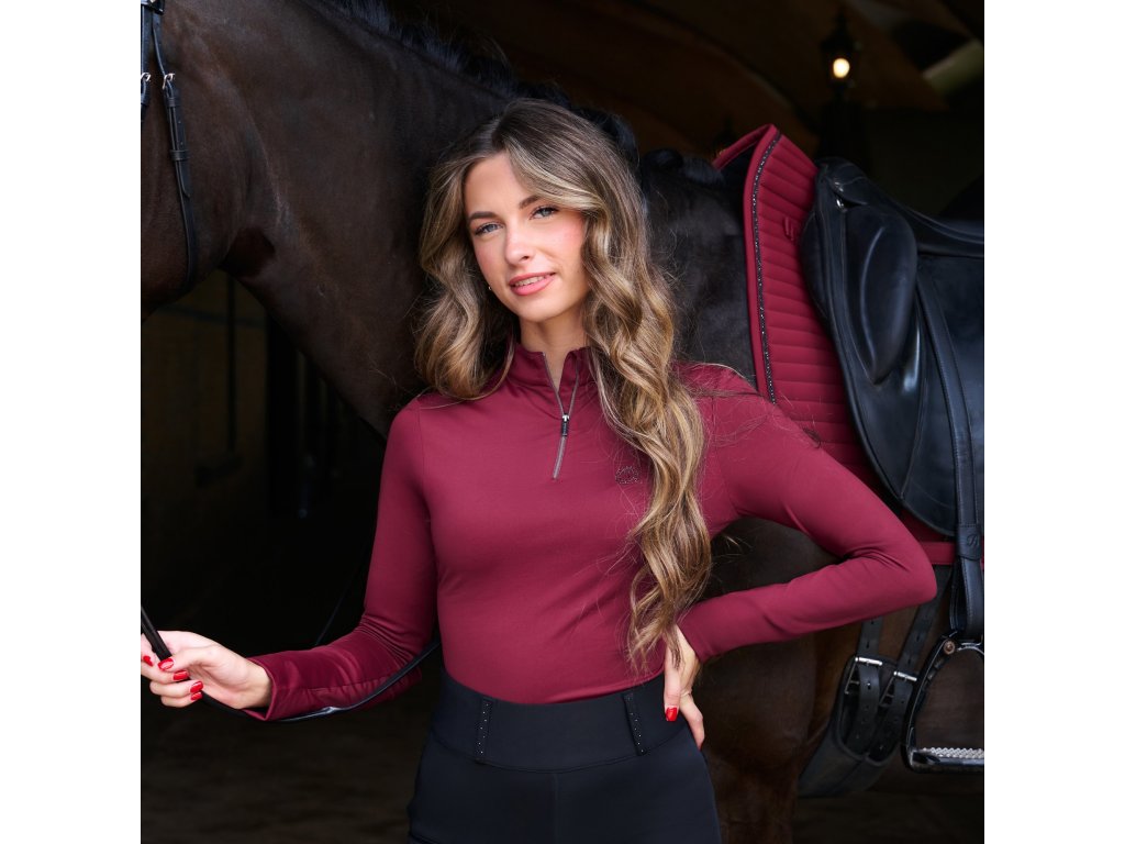 Tričko Amy je štýlový a pohodlný kúsok, ktorý skvele doplní jazdecký outfit do stajne aj na voľný čas. Vďaka polovičnému zipu s vyšším golierom pôsobí moderne a zároveň prakticky. Elastický materiál sa dokonale prispôsobí pohybu a jemne česaná vnútorná strana poskytuje príjemné teplo a komfort po celý deň. Ochrana brady pri zipse zvyšuje pohodlie pri nosení a decentné logo na hrudi podčiarkuje športovo elegantný vzhľad trička.