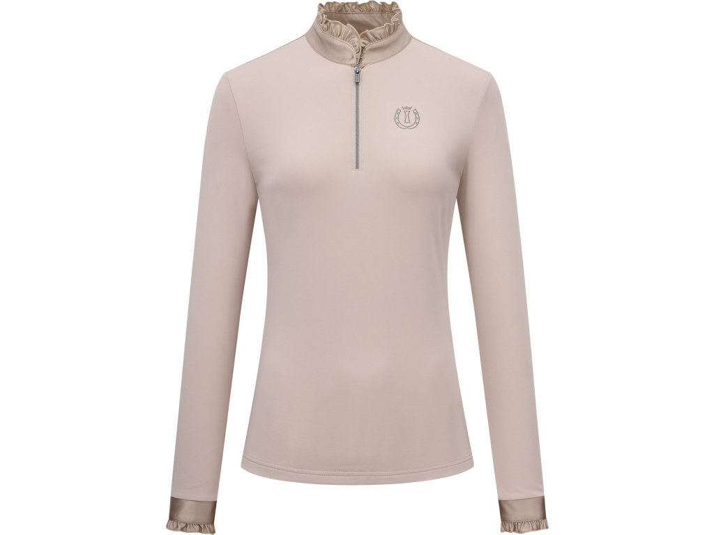 Štýlové tričko s dlhým rukávom, ktoré spája eleganciu, funkčnosť a vysoký komfort pri nosení, je ideálnou voľbou na tréning, prácu v stajni aj bežné nosenie. Tričko je vyrobené z jemného džersejového materiálu s vnútornou česanou úpravou, ktorá zaisťuje príjemný tepelný komfort a pohodlie počas celého dňa. Stojačik, polovičný zips a jemné volániky na golieri aj rukávoch dodávajú tričku elegantný vzhľad. Rýchloschnúci materiál pomáha udržať pocit sviežosti aj pri intenzívnej aktivite a logo Imperial Riding zdobené kamienkami na hrudi podčiarkuje elegantný a výrazný charakter trička.