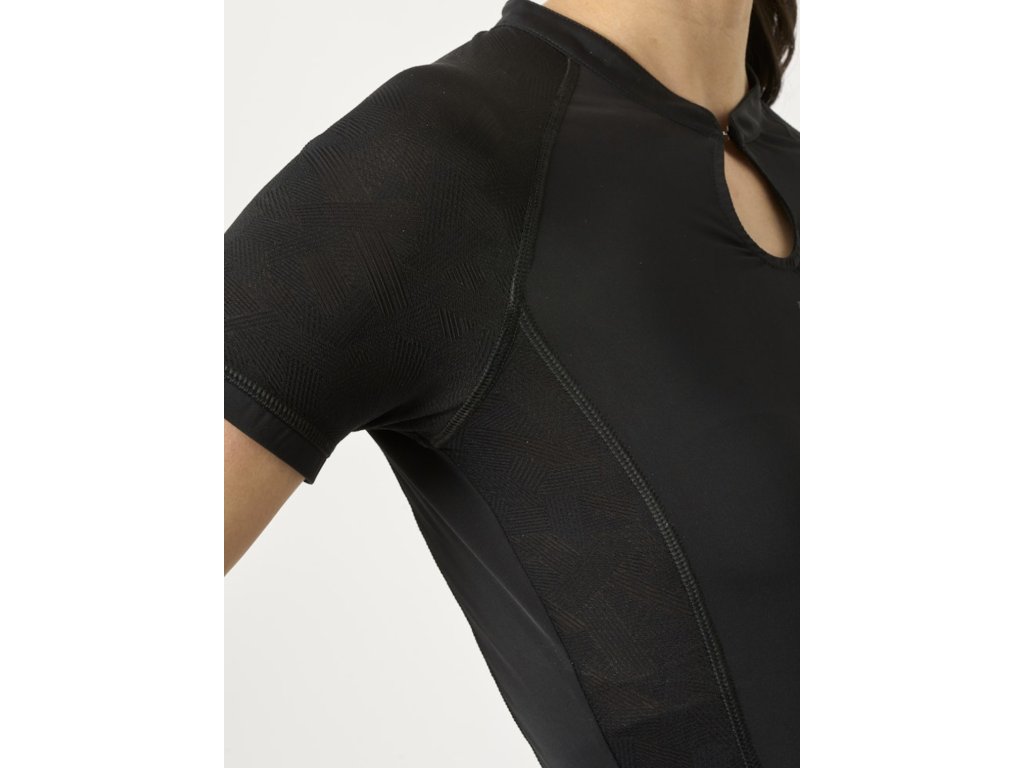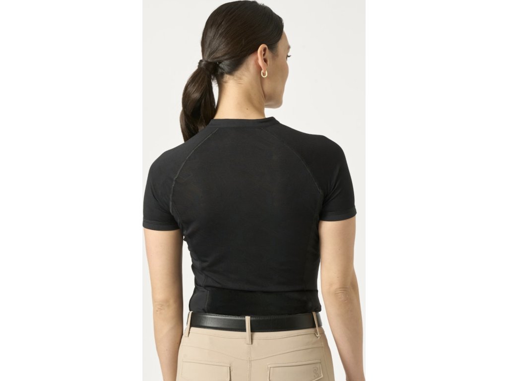 Dámske tričko, ktoré je navrhnuté pre jazdkyne, ktoré požadujú komfort a štýl. Sieťované panely na rukávoch zaisťujú vysokú priedušnosť a pohodlie, takže zostanete v chlade aj počas náročného tréningu či súťaže. Tričko má lichotivý športový strih a elegantné zapínanie na háčik a očko v prednej časti, čo dotvára decentný, ale moderný dizajn. Silikónové logo PS dodáva štýlový a sofistikovaný nádych, ktorý odráža vášeň pre jazdeckú dokonalosť.