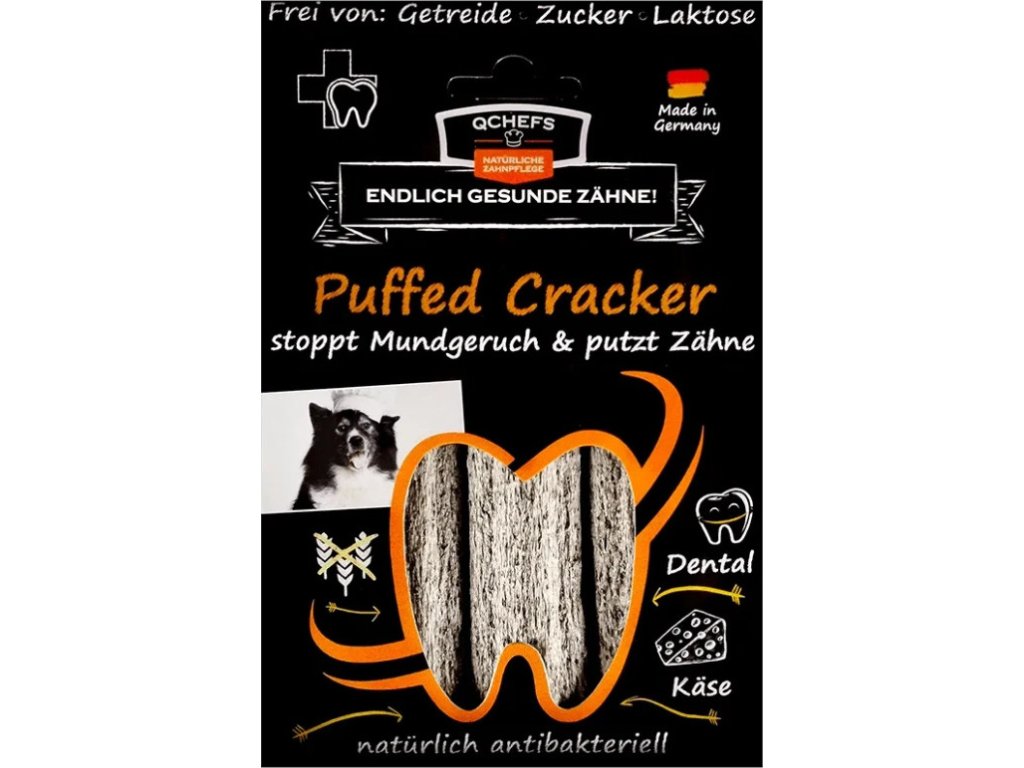 Tyčinky na čistenie zubov pre psov Puffed cracker od QCHEFS je prémiový pamlsok nielen pre starostlivosť o zuby vášho psíka. Je vyrobený z tvarohu, pohánky, bioglycerínu a za studena lisovaných olejov z repky a kokosu. Je preto priamo nabitý minerálmi a vitamínmi z vybraných prírodných surovín a hypoalergénnou hodnotnou bielkovinou z tvarohu. Čo je na ňom ale najlepšie? Mliečna bielkovina má silné antibakteriálne účinky a potláča tvorbu povlaku, ktorý spôsobuje nepríjemný dych, jeho usadzovaním vzniká zubný kameň a v konečnom dôsledku aj zápal ďasien. Pri žuvaní psík povlak zo zubov odstraňuje mechanicky a slinami aktivovaný kazeín, ktorý je v mlieku obsiahnutý, rekonštruuje zubnú sklovinu. Skvelý pôžitok z chrumkania! Ľahké a vzdušné. Tieto tyčinky sú obľúbené najmä u stredných a veľkých psov.
