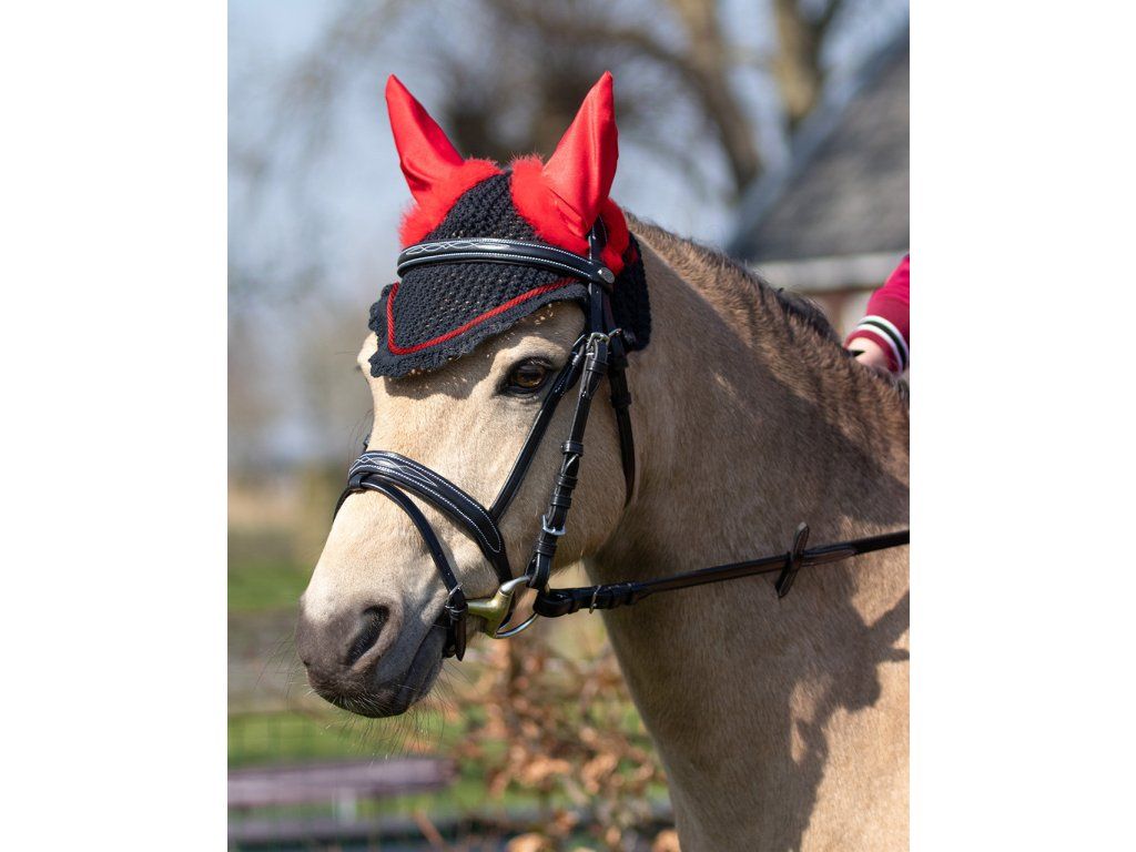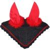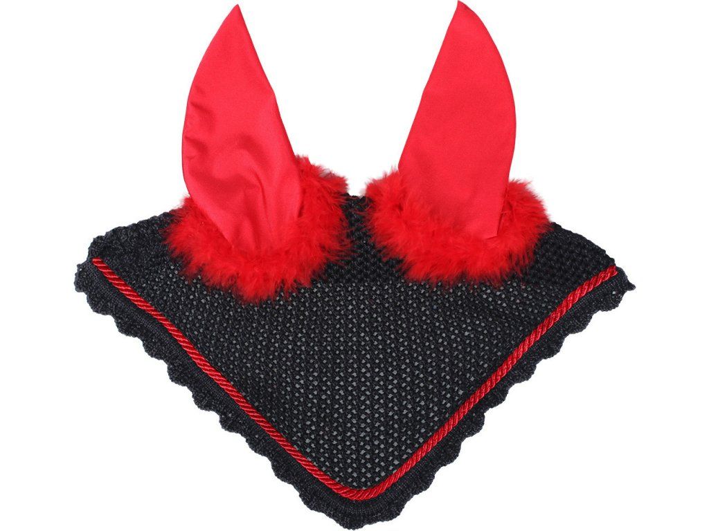 Háčkovaná ušaňa s diabolskými ušami. Uši sú vyrobené z lycry pre väčšie pohodlie. Okolo uší je ušaňa zdobená pierkami. Skvele ladí k ostatným halloweenským produktom.
