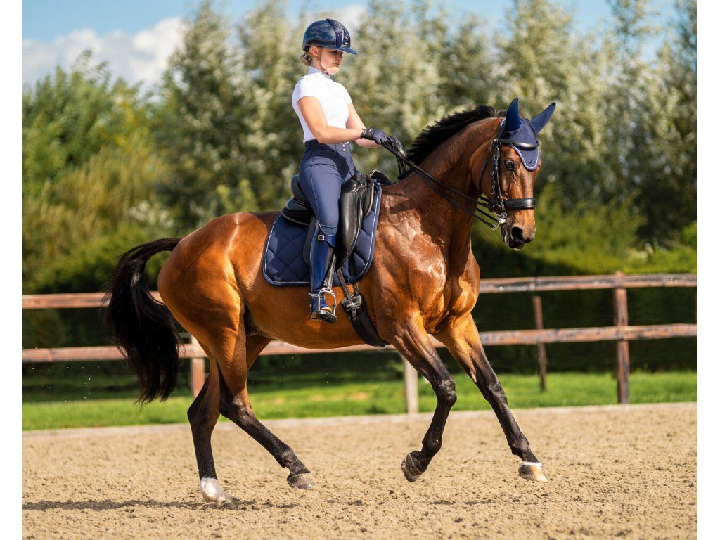 Veľmi kvalitná ušaňa, ktorá slúži ako ochrana pred otravným hmyzom a zároveň znižuje hluk z okolia. To vedie k lepšiemu sústredeniu koňa a k podávaniu lepšieho výkonu. Na zadnej strane uší má sieťovaný pás, ktorý dokonale odvádza prebytočné teplo. Zdobená tenkým strieborným lemom, ktorý jej dodáva elegantný vzhľad. K dispozícii v modrej a čiernej farbe.
