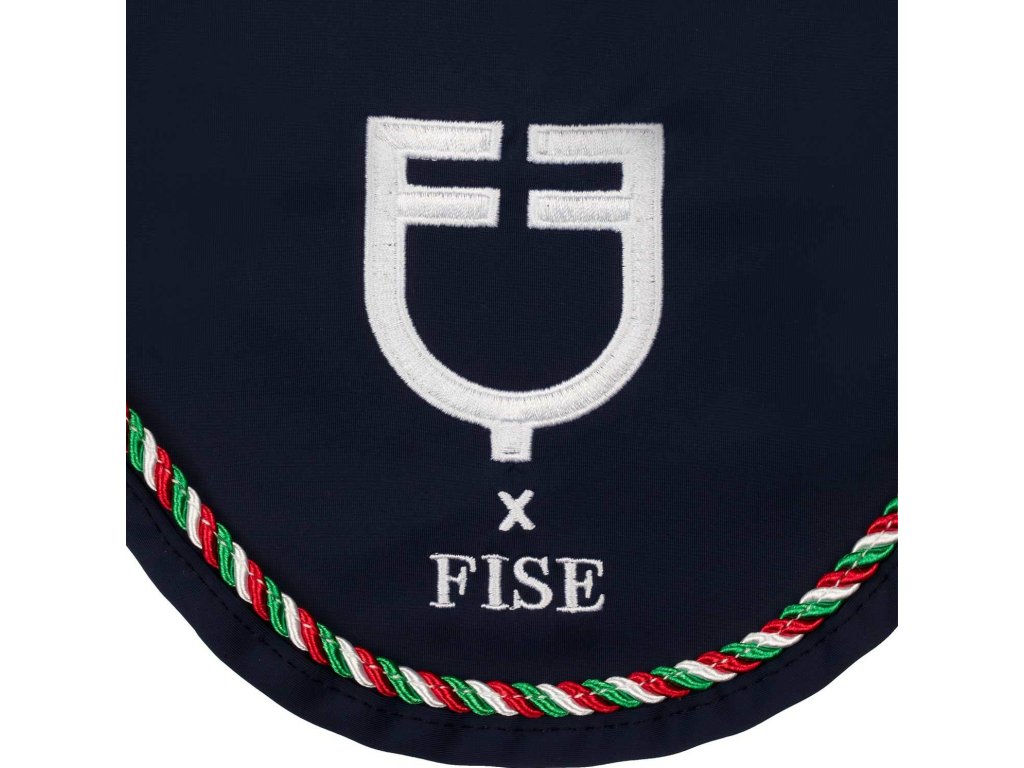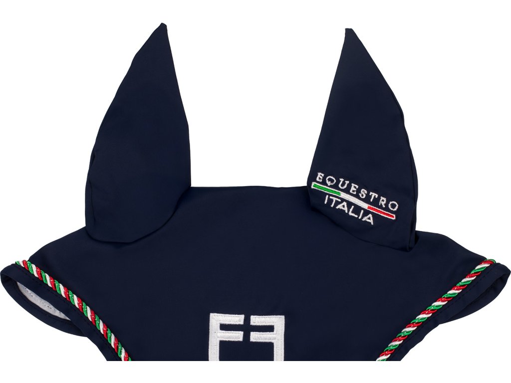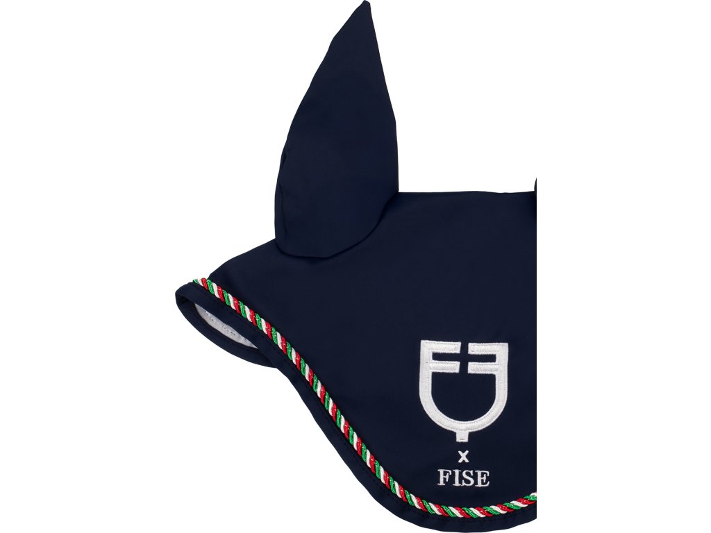 Ušaňa Equestro X Fise je vyrobená z pružného a priedušného technického materiálu, ktorý zaisťuje optimálnu cirkuláciu vzduchu a pohodlie. Dokonale sedí, neobmedzuje v pohybe a ľahko sa udržuje. Chráni uši koňa pred obťažujúcim hmyzom a pomáha tlmiť rušivé zvuky, čo prispieva k upokojeniu a lepšej sústredenosti pri práci. Vďaka jednoduchému a elegantnému prevedeniu s výšivkou loga výrobcu uprostred a na ľavom uchu je ideálnou voľbou na tréning aj preteky, navyše je lemovaná kontrastným lemom vo farbách talianskej trikolóry.