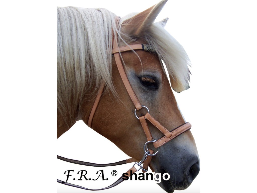 Bezzubadlová westernová uzdečka Shango od značky F.R.A. je vyrobená z prírodnej byvolej kože. Má mäkký polstrovaný okrúhly nánosník a čelenku s ozdobným prvkom uprostred. Táto uzdečka môže pomôcť zlepšiť komunikáciu medzi koňom a jazdcom. Spoločne s uzdečkou sú dodávané protišmykové oťaže s karabínkami. Všetky kovania na uzdečke sú striebornej farby. V rámci bezzubadlového diagramu F.R.A. spadá pod číslo 3.Je vhodná najmä pre citlivé a mladé kone, ktoré sa s uzdečkou ešte len zoznamujú alebo majú problém s prijatím zubadla.