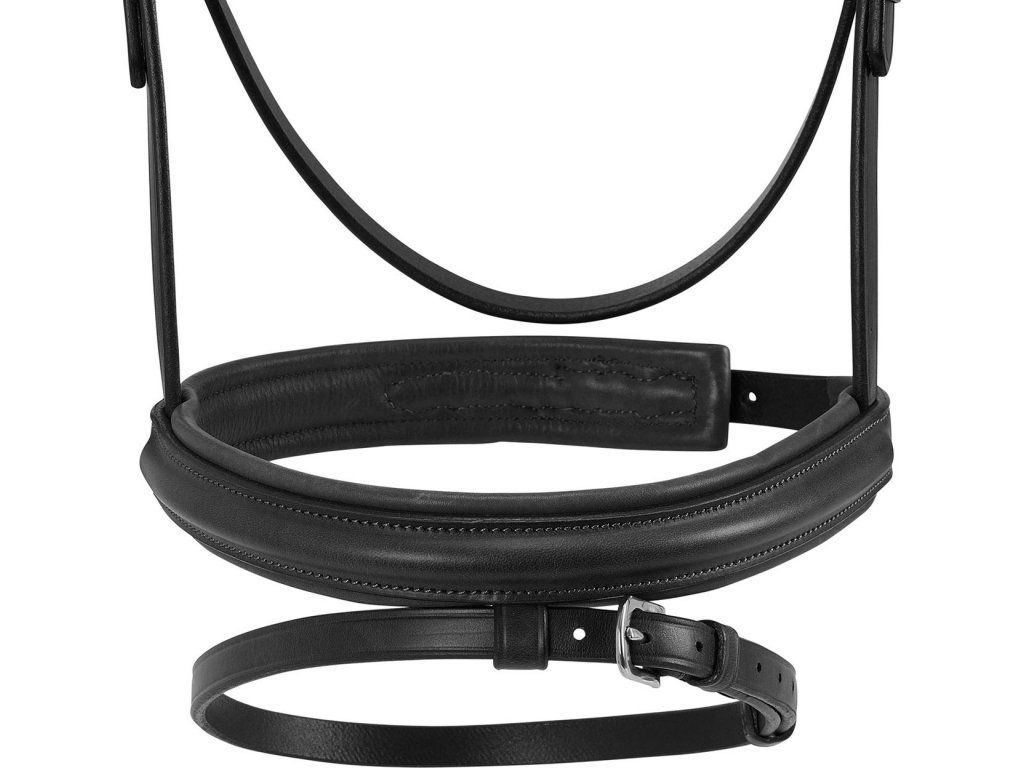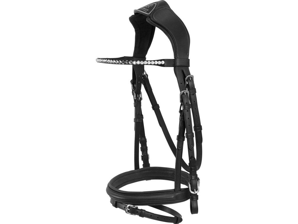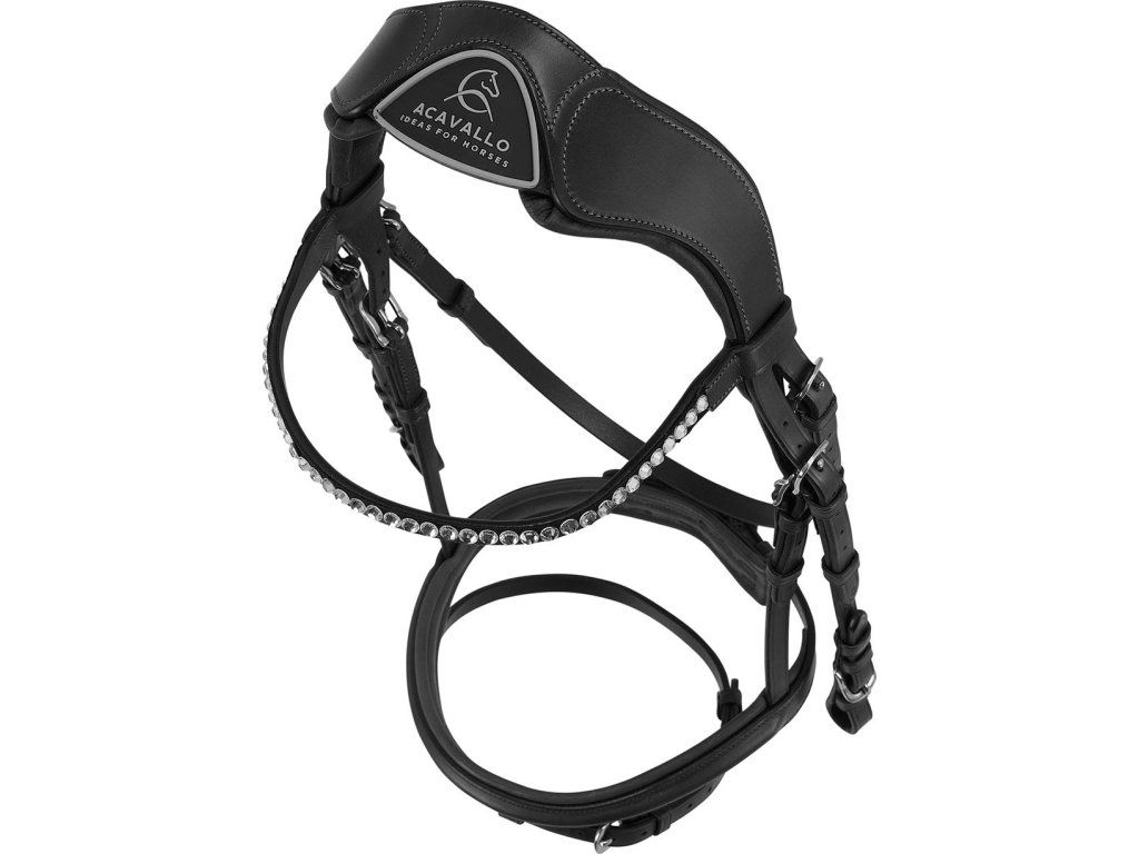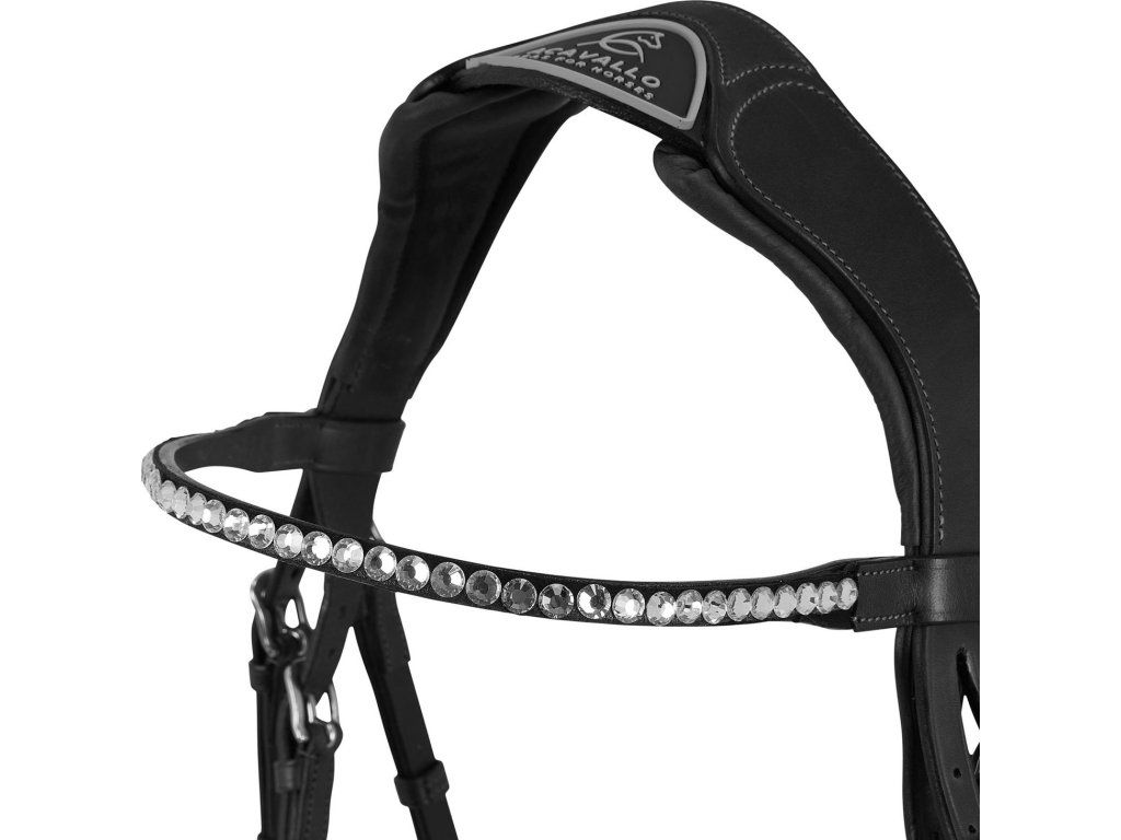 Vysokokvalitná uzdečka z veľmi mäkkej pravej talianskej hovädzej kože s anglickým kombinovaným nánosníkom. Má široký, ergonomický a anatomicky tvarovaný nátylník. Lícnice sa dajú polohovať pomocou inovatívneho patentovaného jednoducho nastaviteľného systému (kovové posuvné zariadenie), ktorý zabraňuje pritlačeniu lícnych nervov, svalov a čeľustných kĺbov a umožňuje koňovi hrýzť a dýchať prirodzenejšie než s konvenčnými uzdečkami. Systém umožňuje nastaviť lícnice tak, aby netlačili na kosť, čím sa zabráni ich odieraniu. Latexová vypchávka na nátylníku so špeciálnou elastickou vložkou uvoľňuje tlak na zátylok a krčnú chrbticu. Ide o jednu z najcitlivejších oblastí koňa, vďaka voľnému priestoru (v oblasti loga Acavallo) nie je vyvíjaný taký tlak na zátylok, rovnomernejšie sa rozloží a zaistí koňovi komfort. Disponuje úzkou čelenkou zdobenou kryštálikmi, spoje sú vyrobené z nerezovej ocele. Uzdečka perfektne sedí.
