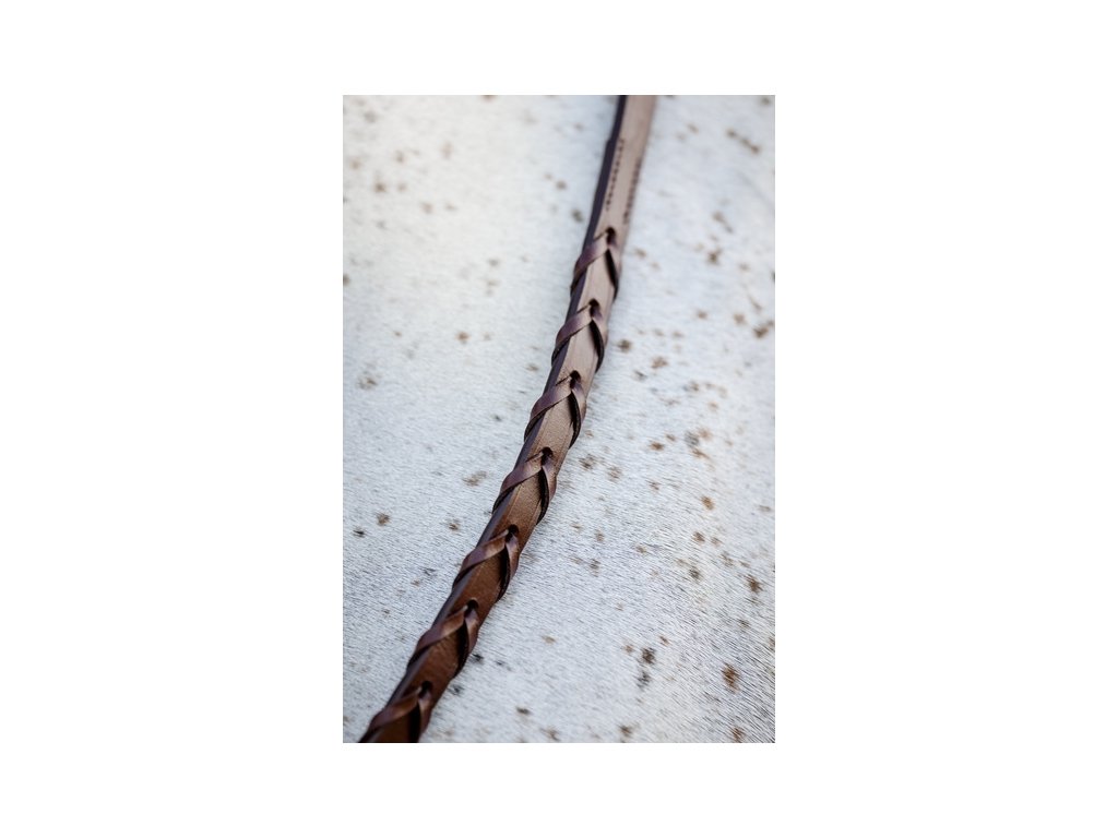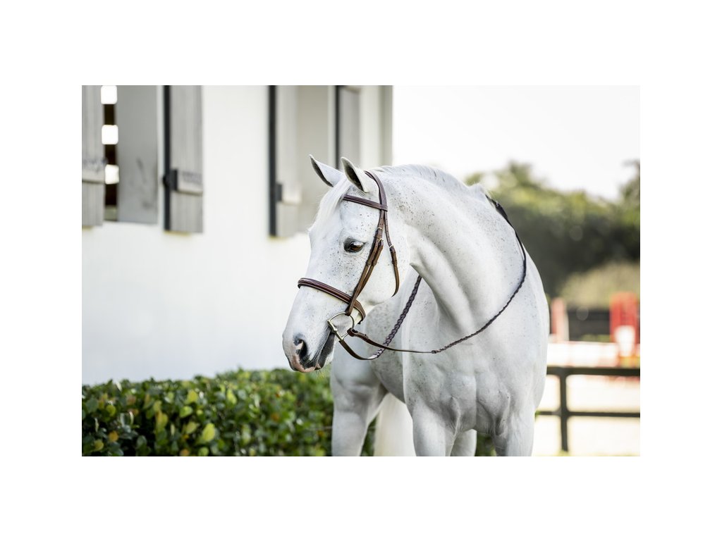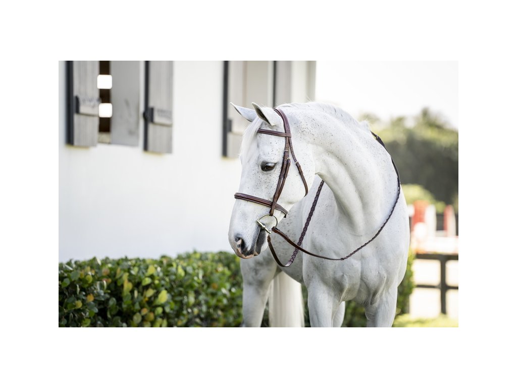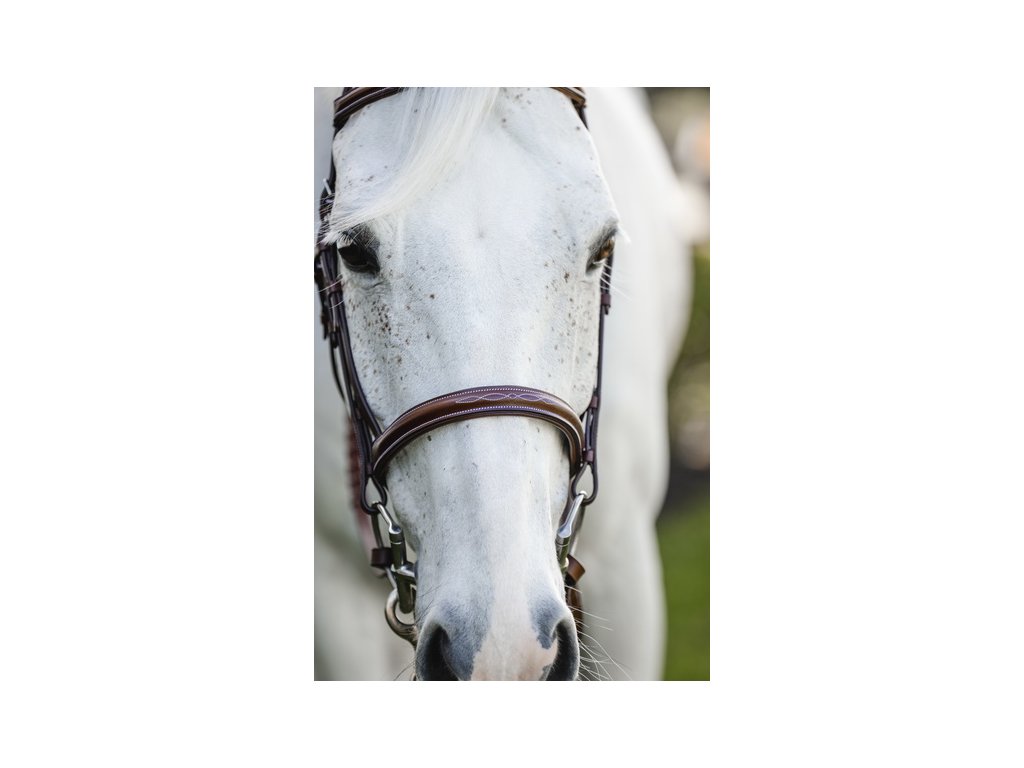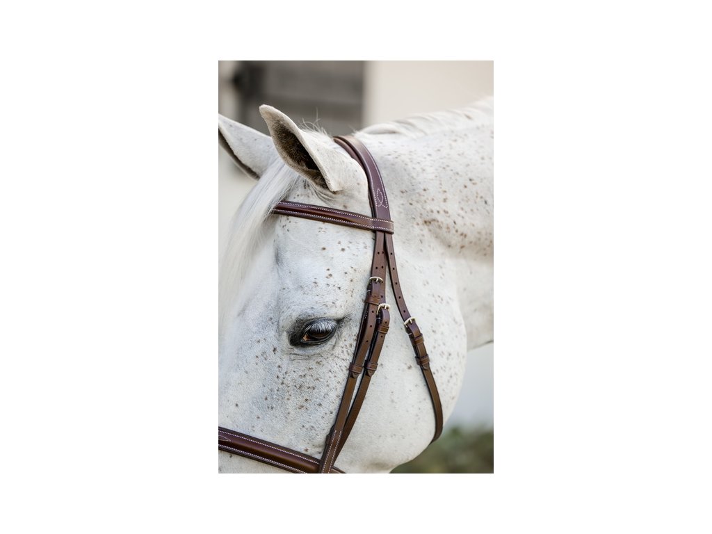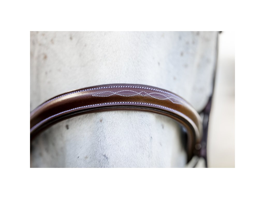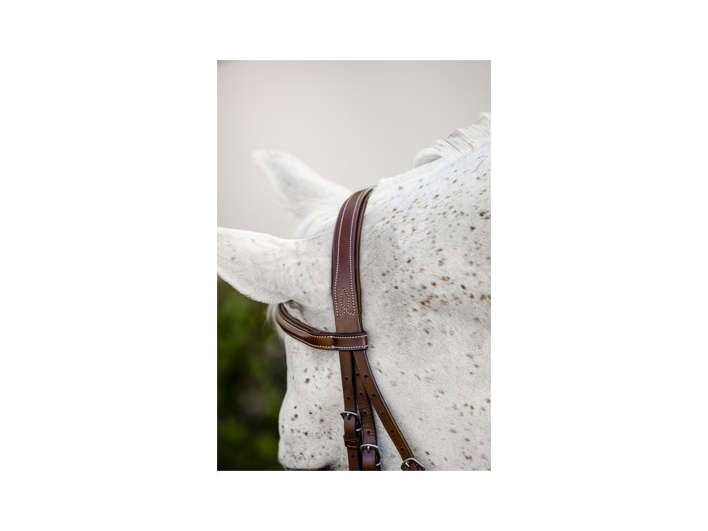 Elegantná uzdečka z kvalitnej a mäkkej kože s polstrovaným nátylníkom pre maximálne pohodlie a lícnicami so zapínaním na pracky. Čelenka a anglický nánosník sú zdobené kontrastným prešívaním v hunter štýle, ktorý dodáva uzdečke vycibrený vzhľad. Súčasťou sú ladiace prešívané oťaže.