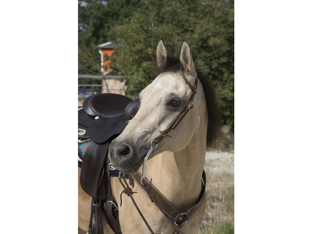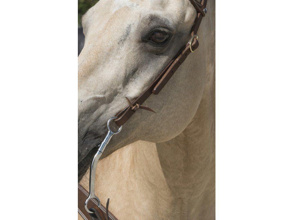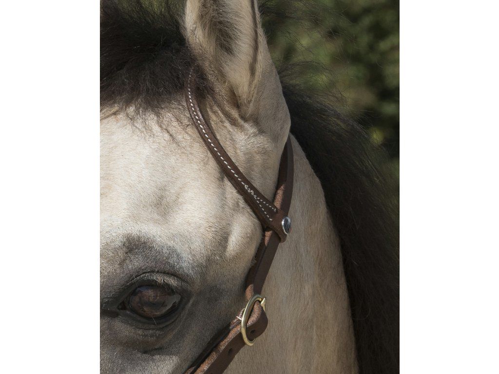Westernová uzdečka Oreille (by Franck Perret) z veľmi kvalitnej a odolnej hovädzej kože. Vybavená jedným pútkom na ucho a latigo pásikmi. Doplnená mosadznými prackami. Oťaže nie sú súčasťou balenia. Veľkosť FULL.