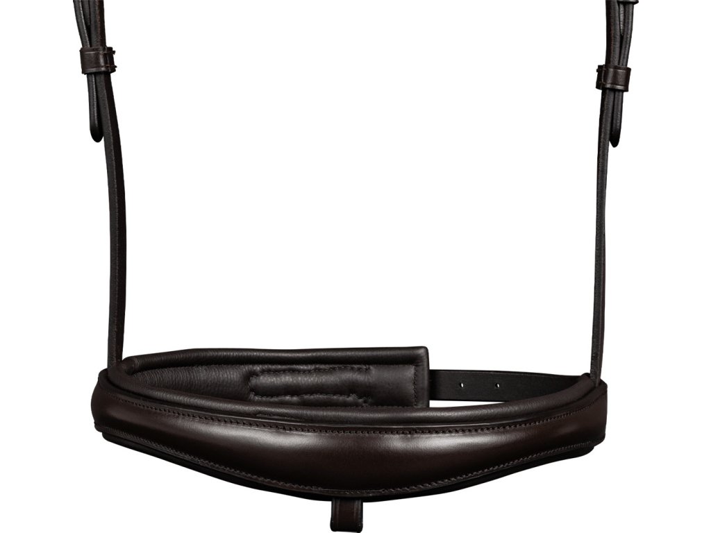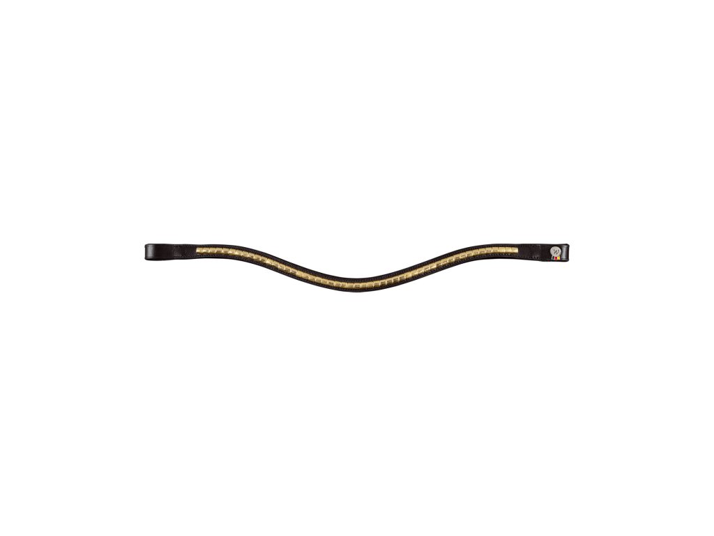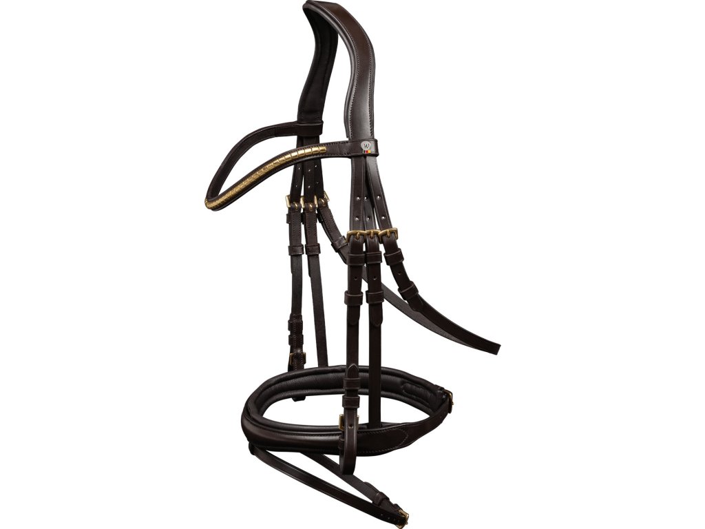 Kvalitná uzdečka zo série X-line s anglickým kombinovaným nánosníkom a anatomicky tvarovaným nátylníkom. Anatomický nátylník zaisťuje dostatočnú voľnosť pre uši. Mäkké polstrovanie v oblasti nánosníka, nátylníka a čelenky poskytuje maximálne pohodlie. Uzdečka má zakrivenú čelenku zdobenú retiazkou v zlatej farbe. Všetky kovania sú vyrobené z kvalitnej nerezovej ocele. Uzdečka sa dodáva s oťažami (19 mm).