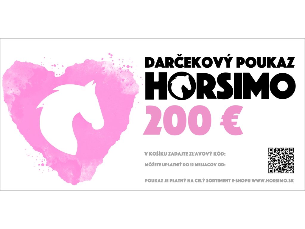 Darčekový poukaz v hodnote 200 € s platnosťou 12 mesiacov od dátumu zakúpenia. Poukaz je možné využiť na nákup akéhokoľvek tovaru v e-shope alebo showroome HORSIMO.sk. Poukaz pošleme e-mailom vo formáte PDF alebo ho vytlačíme a pošleme dopravcom podľa vášho výberu z aktuálnej ponuky dopravy.