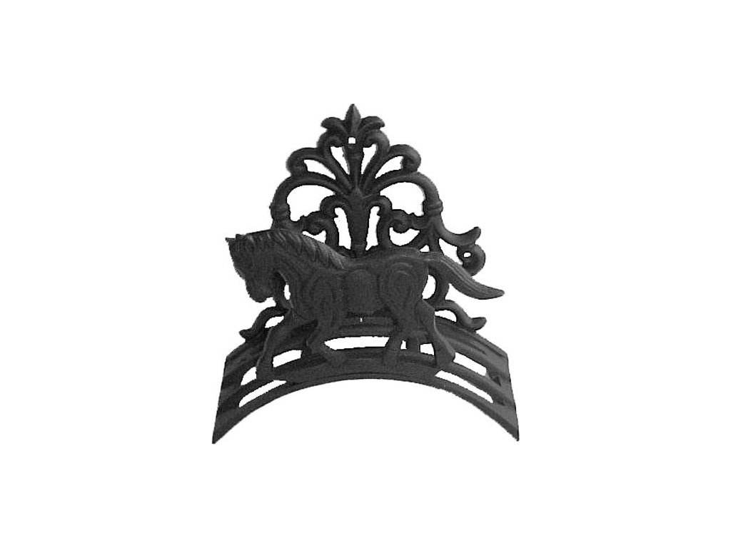 Ozdobný vešiak na hadiu s motívom koňa od značky HKM. Vyrobený z pevnej liatiny. Výška je cca 30 cm a šírka cca 25,5 cm.