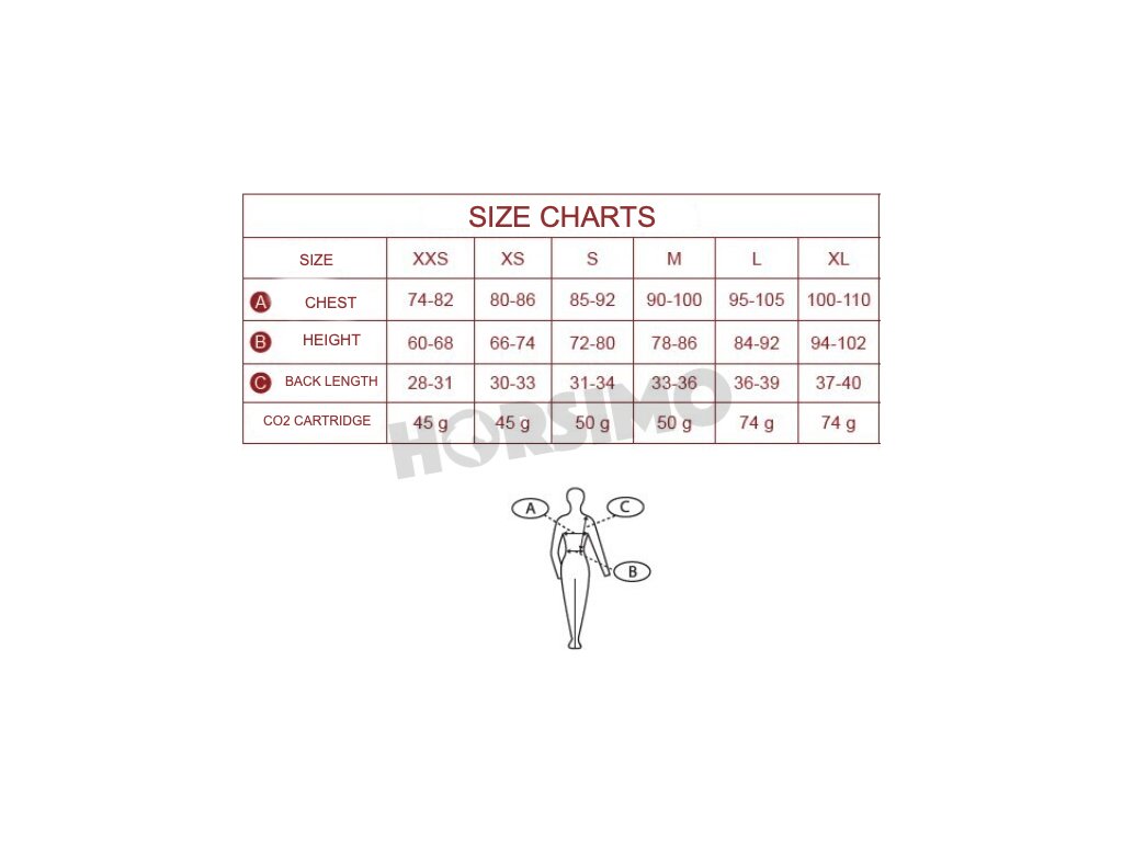 - náhradnú CO₂ kartušu je možné dokúpiť zvlášť: XXS–XS (detské) 45 g, S–M 50 g, L–XL 74 g