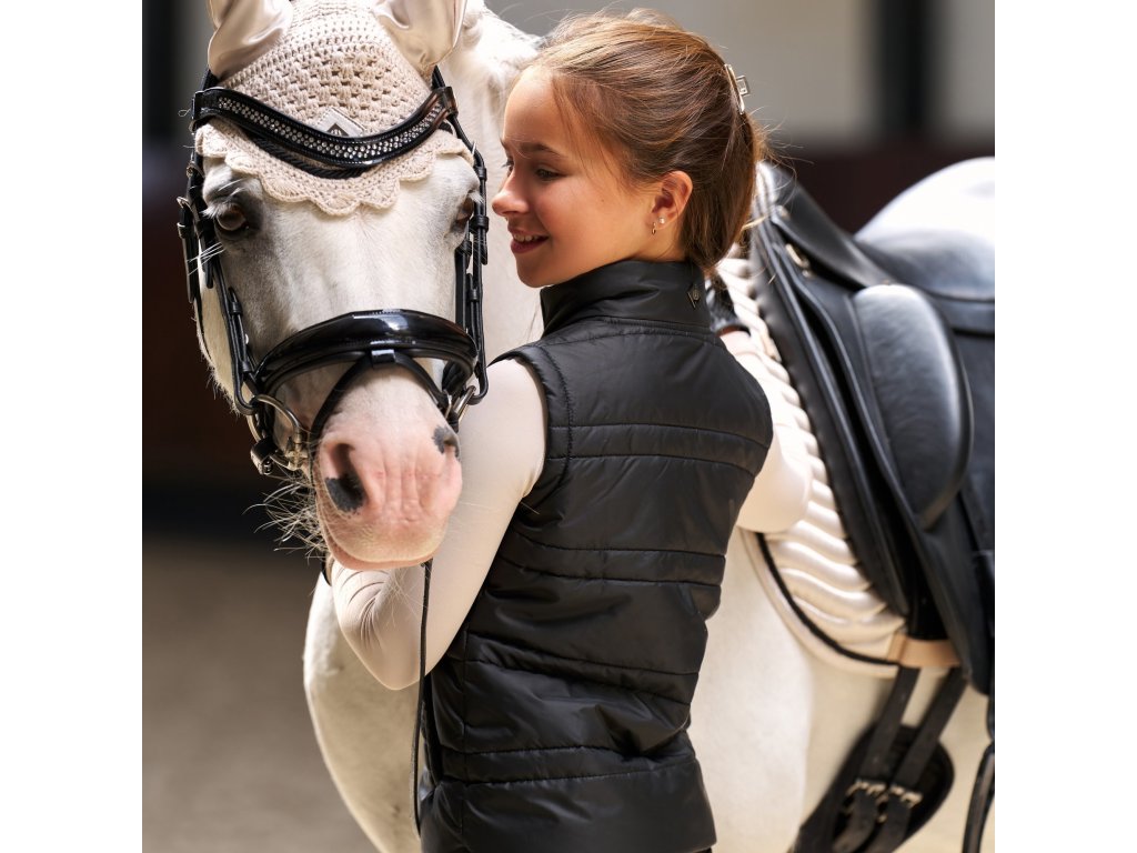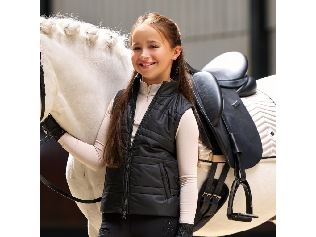 Detská vesta Bonnie je štýlová a pohodlná prešívaná vesta, ktorá poteší každú malú jazdkyňu. Horizontálne prešívanie dodáva veste trendy vzhľad a mäkká džersejová podšívka zabezpečuje príjemné teplo a komfort pri nosení. Vďaka obojsmernému prednému zipsu sa vesta ľahko oblieka a prispôsobí pohybu dieťaťa. Skryté vrecká na zips bezpečne uchovajú drobnosti.