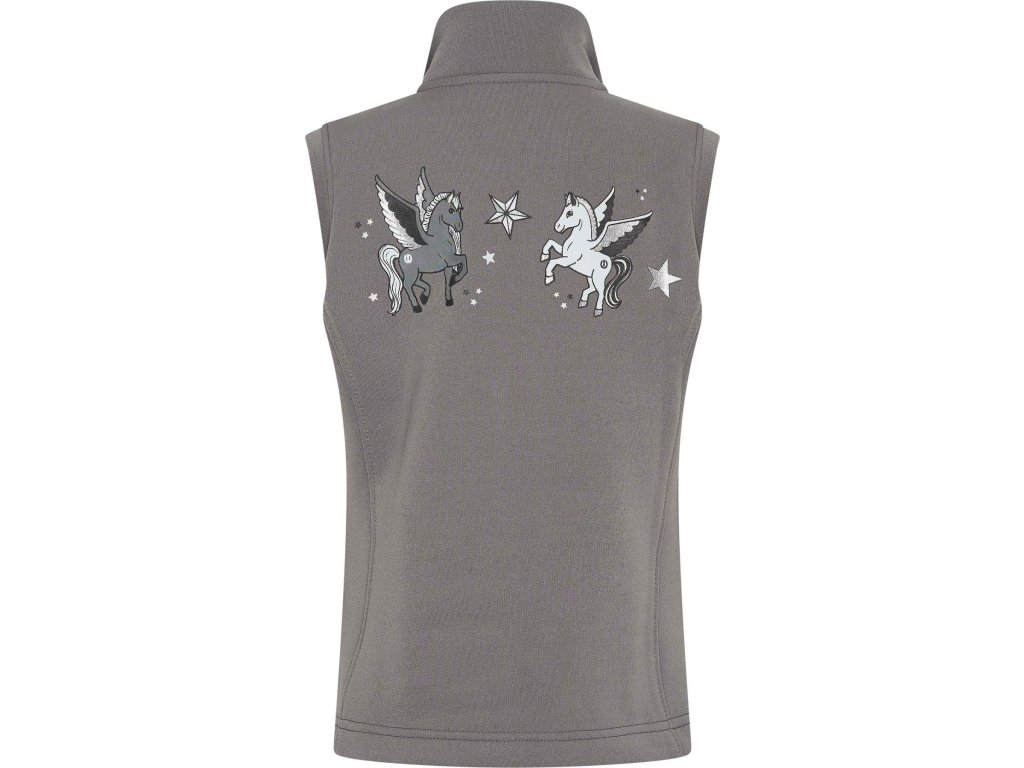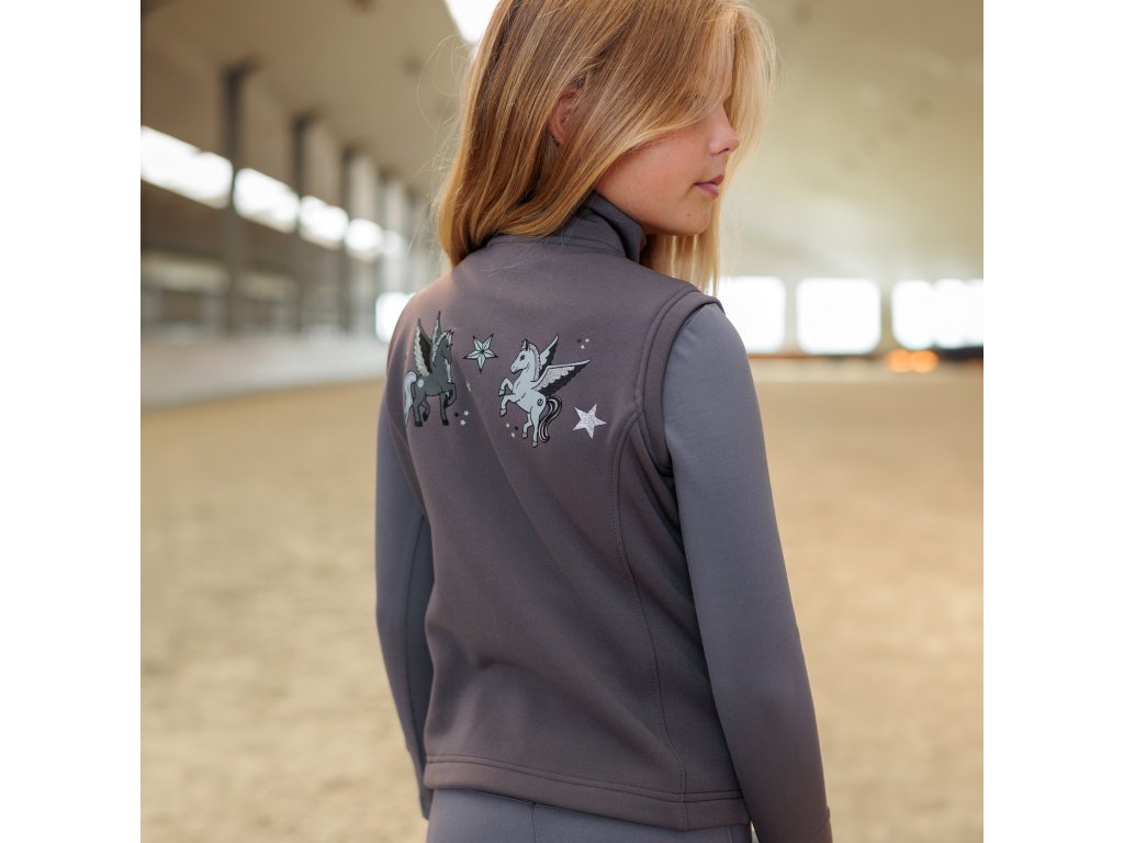 Detská vesta Carry je štýlovým a praktickým kúskom do stajne aj na voľný čas. Zapínanie na zips po celej dĺžke uľahčuje obliekanie a stojačik príjemne chráni krk pred chladom. Vesta má dve praktické vrecká na zips, do ktorých možno bezpečne uložiť drobnosti. Zadnú časť zdobí výšivka dvoch koní s hviezdami a na ľavej strane hrudi nechýba logo z trblietavých kamienkov. Pružný materiál zabezpečuje pohodlie a voľnosť pohybu pri každej aktivite.