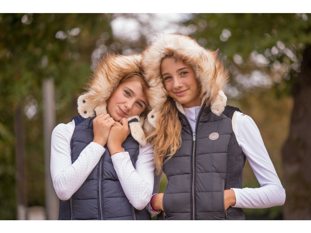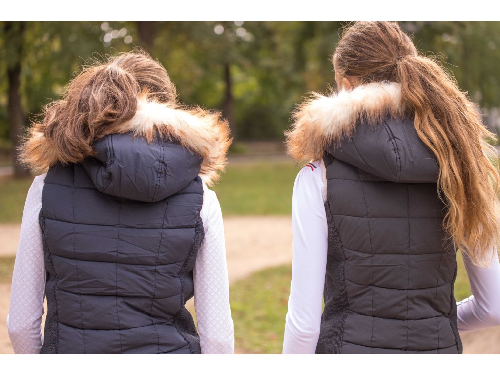 Dámska teplá vesta New Roger podšitá mäkkým a hrejivým fleecom. Má výrazný predný zips, dve vrecká na zips a odnímateľnú kapucňu s lemovaním z umelej kožušiny, ktoré je možné rovnako odopnúť. Jemne trblietavý vrchný materiál a nášivka loga Penelope na hrudi dodávajú veste ženský a elegantný vzhľad. Pre väčšie pohodlie a prispôsobivosť rôznym typom postáv je po stranách a na spodnom leme pružný rebrovaný materiál.