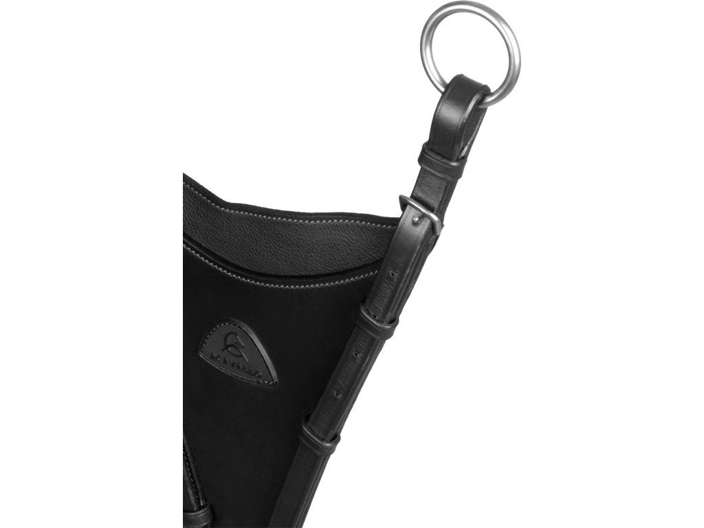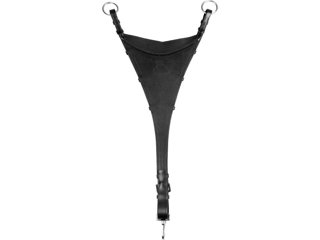 Martingalová vidlica vyrobená z vysokokvalitnej, mäkkej kože, ktorá zaručuje pohodlie a dlhú životnosť. Zosilnené prešívanie dodáva pevnosť a odolnosť, zatiaľ čo priedušná podšívka minimalizuje riziko podráždenia kože. Vďaka vejárovitému tvaru zostávajú oťaže v stabilnej polohe. Vidlica je vybavená oceľovými krúžkami a praktickou karabínou pre jednoduché upevnenie. Štýlové spracovanie s decentným logom uprostred spája funkčnosť, eleganciu a štýl, ideálna voľba pre náročných jazdcov.