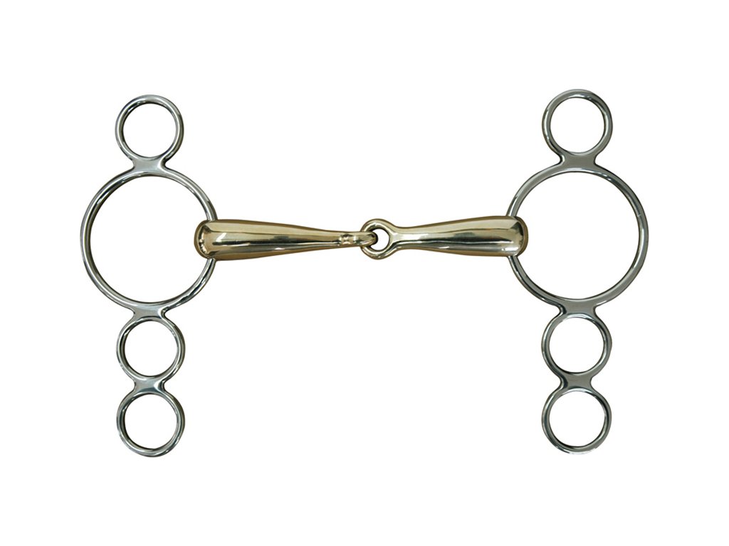 Zubadlo jedenkrát lomené, snehuliak, so štyrmi krúžkami od značky Umbria Equitazione s krúžkami z nerezovej ocele a s medeným udítkom (German Copper). Zubadlo typu snehuliak môžete použiť ako obyčajné stihlo alebo silnú páku - záleží na tom, ako sú upevnené oťaže. K dispozícii vo viacerých veľkostiach.